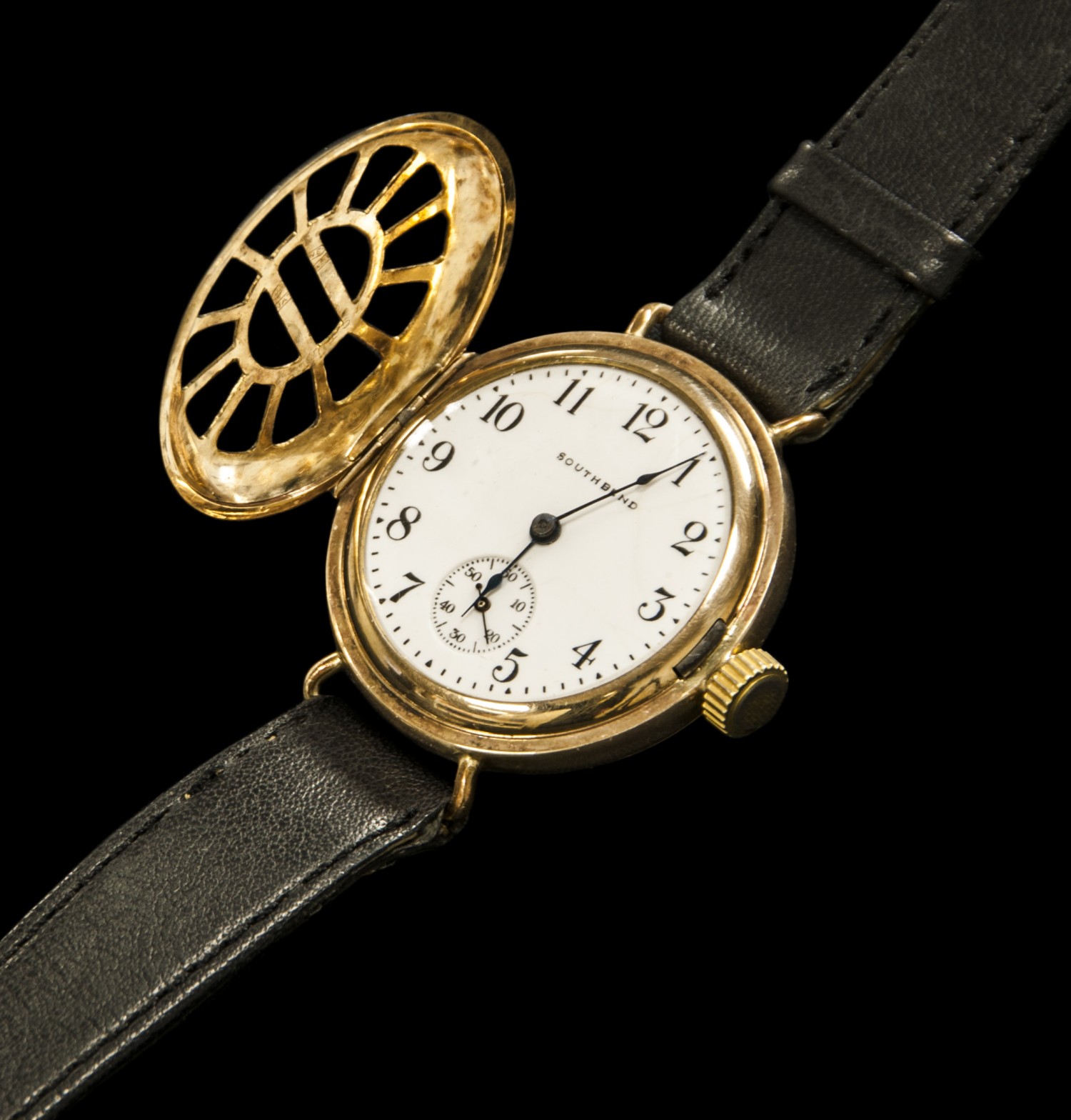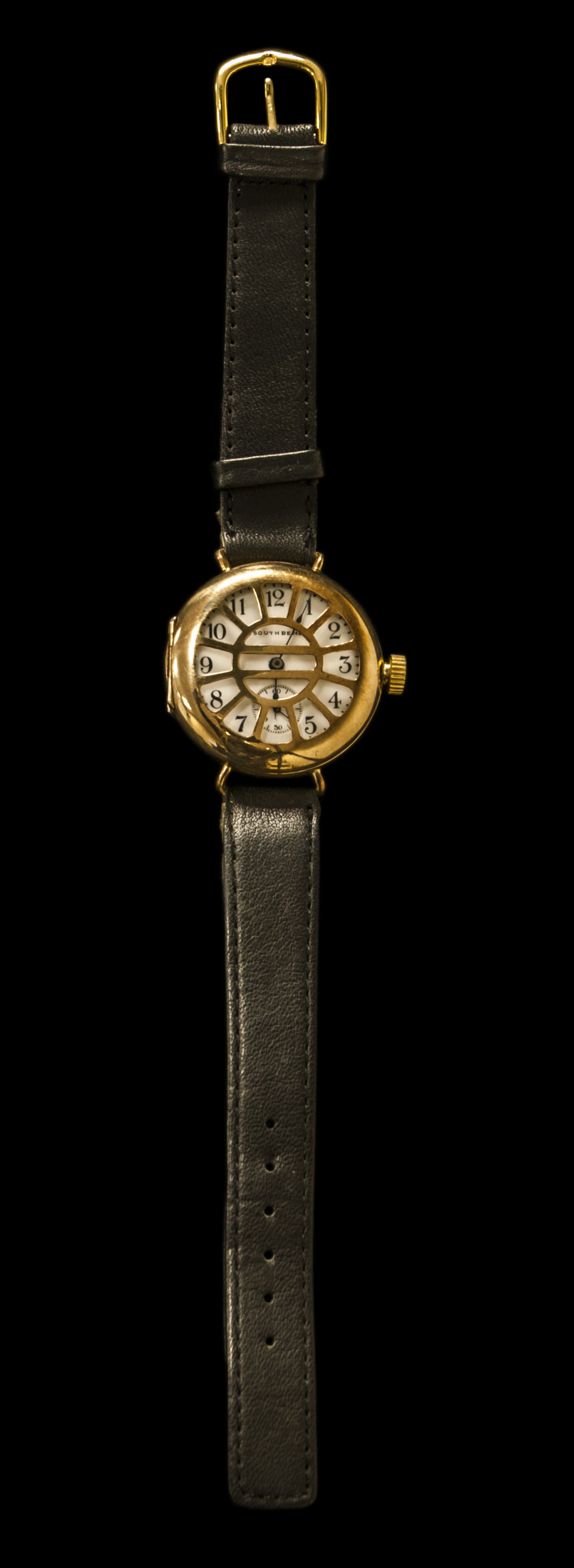 | Description | A “trench watch” was a traditional wrist watch with a metal face guard to protect the watch face from scratching or other damage caused by extended time in the elements of a warzone. The face guard could be lifted to give the wearer a clearer view of the time. This example is unique in that it features 24 karat gold and the leather is in exceptional condition suggesting it may have been replaced sometime in the post war era, or barely worn during the war itself, or by a person who saw limited outdoor duty. |