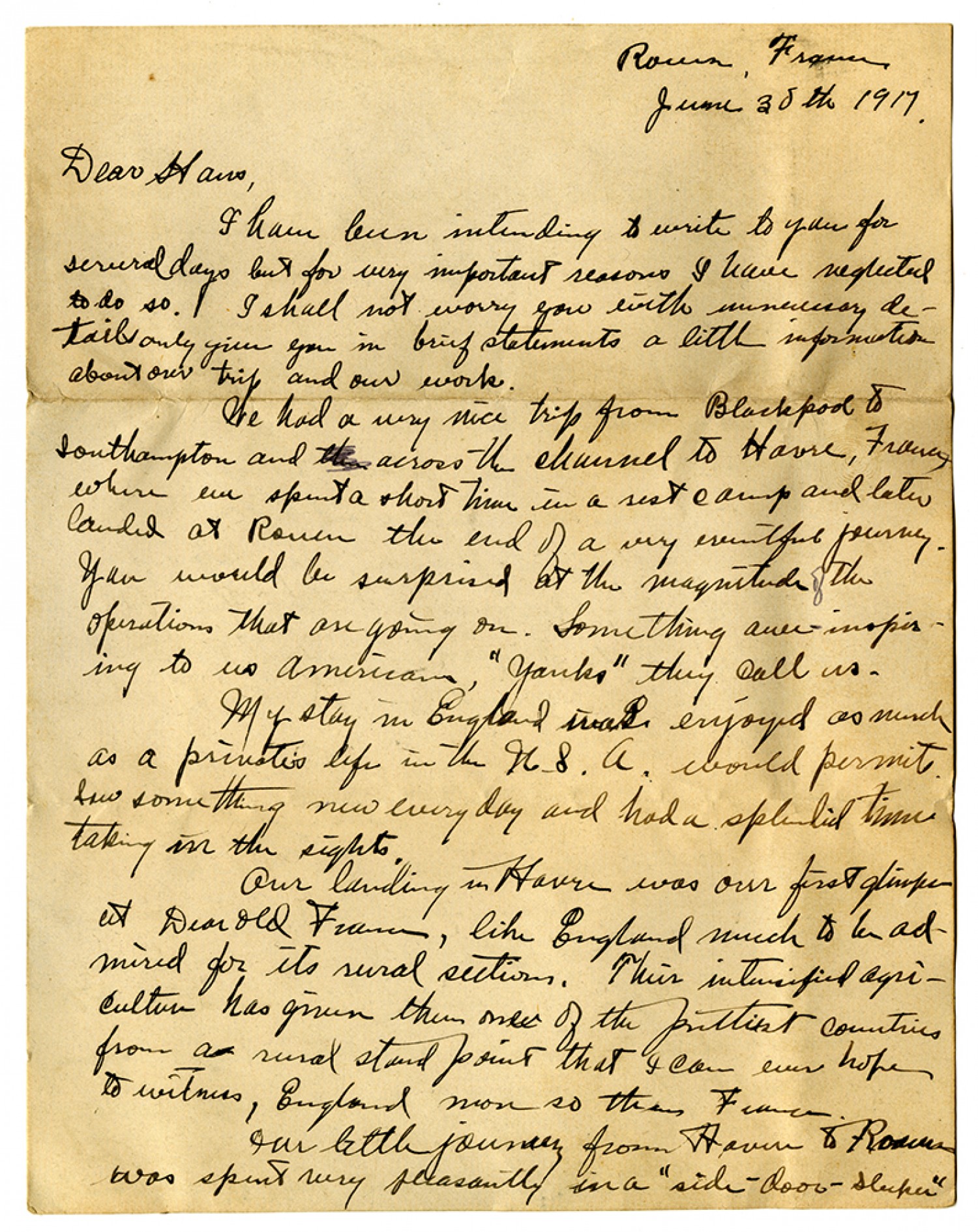 Rouen, France June 25th 1917. Dear Hans, I have been intending to write to you for several days but for very important reasons I have neglected to do so. I shall not worry you with unnecessary details only give you in brief statements a little information about our trip and our work. We had a very nice trip from Blackpool to Southampton and across the channel to Havre, France, where we spent a short time in a rest camp and later landed at Rouen the end of a very eventful journey. You would be surprised at the magnitude of the operations that are going on. Something awe-inspiring to us Americans, "Yanks" they call us. My stay in England was enjoyed as much as a privates life in the U.S.A. would permit. Saw something new every day and had a splendid time taking in the sights. Our landing in Havre was our first glimpse at Dear Old France, like England much to be admired for its rural sections. This intensified agriculture has given them one of the prettiest countries from a rural stand point that I can ever hope to witness, England more so than France. Our little journey from Havre to Rouen was spent very pleasantly in a "side-door-sleeper"