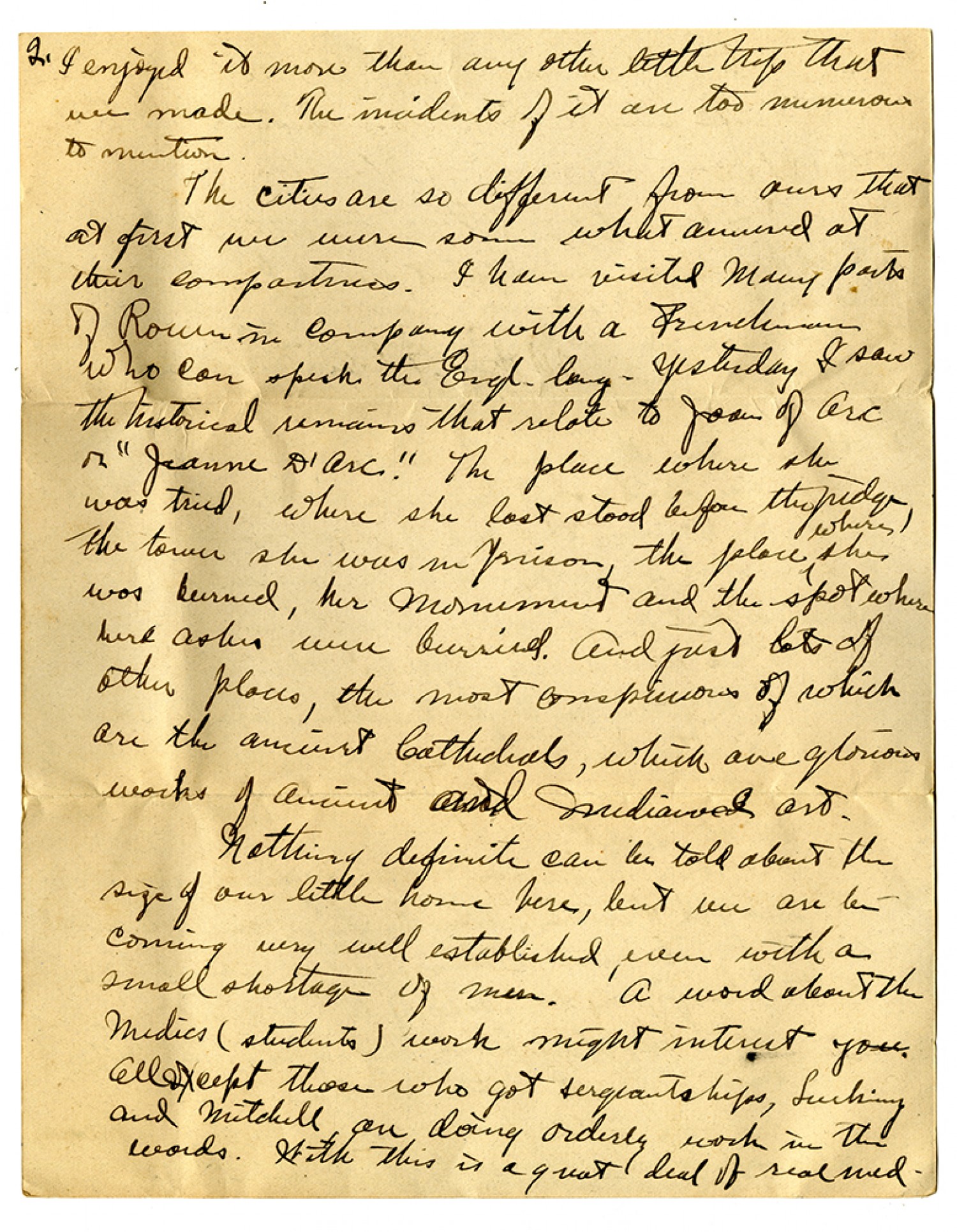 [page 2] I enjoyed it more than any other little trip that we made. The incidents of it are too numerous to mention. The cities are so different from ours that at first we were some what amused at their [ms illegible: 1 wd]. I have visited many parts of Rouen in company with a Frenchman who can speak the Engl. lang. Yesterday I saw the historical remains that relate to Joan of Arc or "Jeanne D'Arc." The place where she was tried, where she last stood before the [ms illegible: 1 wd] the tower she was in prison, the place where she was burned, her Monument and the spot where her ashes were buried. And just lots of other places, the most conspicuous of which are the ancient Cathedrals, which are glorious works of Ancient and Mediaivel art. Nothing definite can be told about the size of our little home here, lest we are becoming very well established, even with a small shortage of men. A word about the medics (students) work might interest you. All except those who got sergeantships, Lucking and Mitchell are doing orderly work in the wards. With this is a great deal of real med-