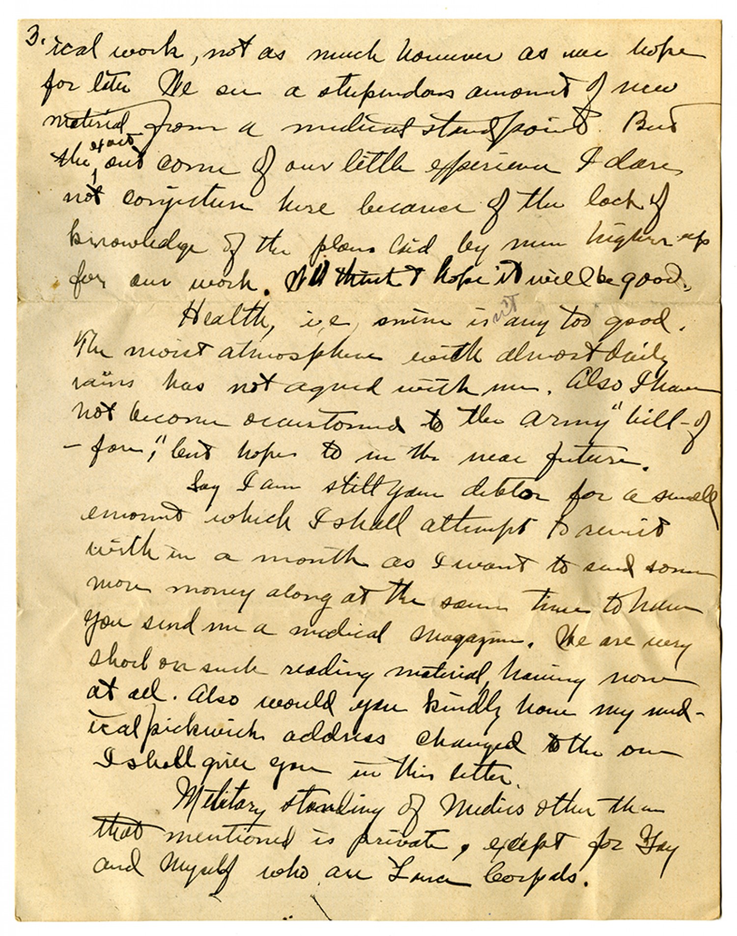 [page 3] ical work, not as much however as we hope for later We are a stupendous amount of new material from a medical standpoint. But the exact out come of our little experience I dare not conjecture here because of the lack of knowledge of the plans laid by men higher up for our work. All think & hope it will be good. Health, [ms illegible: 2 wds] isn't any too good. The moist atmosphere with almost daily rains has not agreed with me. Also I have not become accustomed to the army "bill-of-fare," lent hope to in the near future. Say I am still your debtor for a small amount which I shall attempt to revisit with in a month as I want to send some more money along at the same time to have you send me a medical magazine. We are very short on such reading material, having none at all. Also would you kindly have my medical pickwick address changed to the one I shall give you in this letter. Military standing of Medics other than that mentioned is private, except for Fay and myself who are Lance Corporals.
