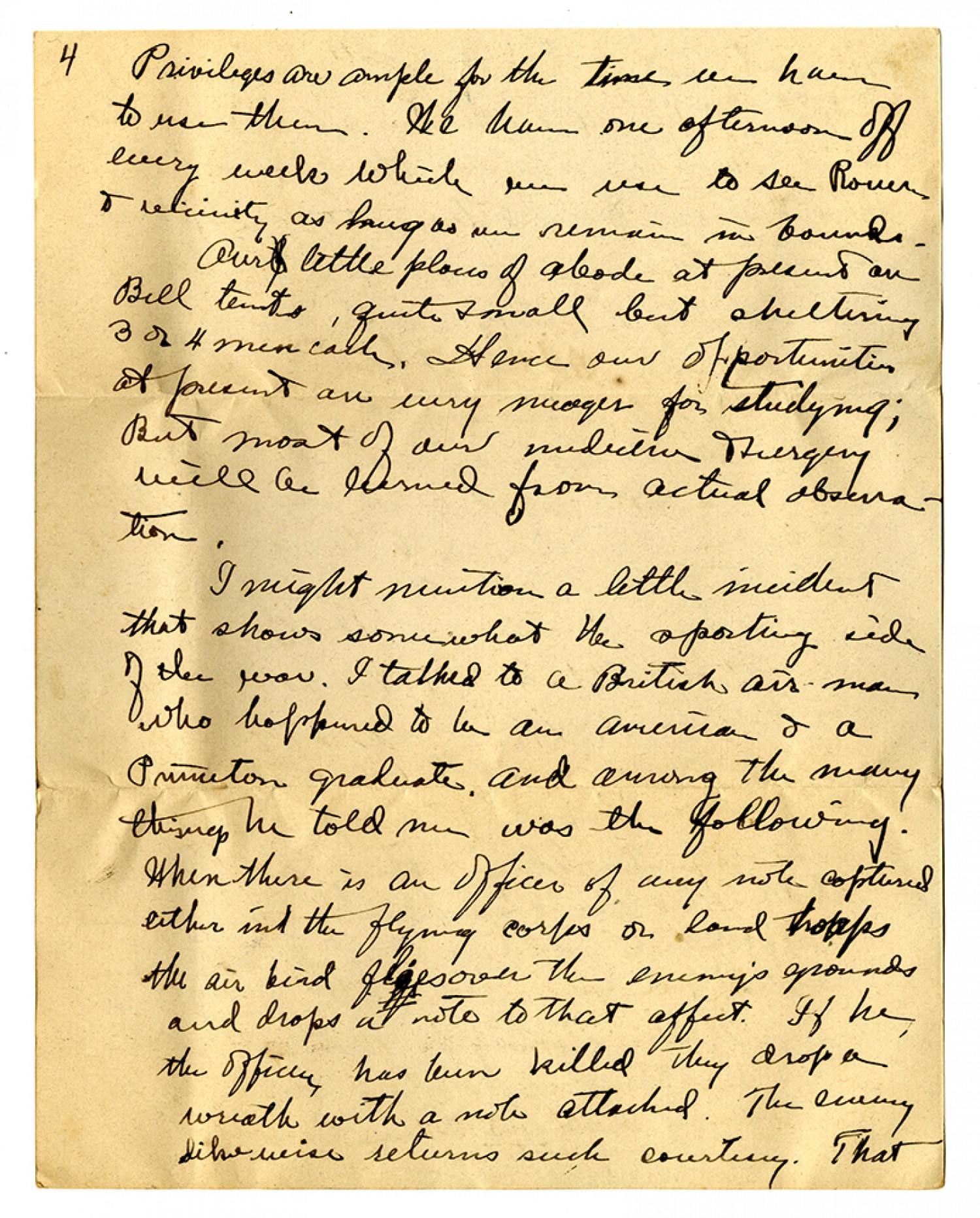 [page 4] Privileges are ample for the time we have to use them. We have one afternoon off every week which we use to see Rouen & vicinity as long as we remain in bounds. Our little places of abode at present are Bell tents, quite small but sheltering 3 or 4 men each. Hence our opportunities at present are very meager for studying; But most of our medicine & surgery will be learned from actual observation. I might mention a little incident that shows somewhat the sporting side of the war. I talked to a British air-man who happened to be an American & a Princeton graduate and among the many things he told me was the following. When there is an officer of any note captured either in the flying corps or the land troops the air kind flies over the enemy's grounds and drops a note to that affect. If he, the officer, has been killed they drop a wreath with a note attached. The enemy likewise returns such courtesy. That