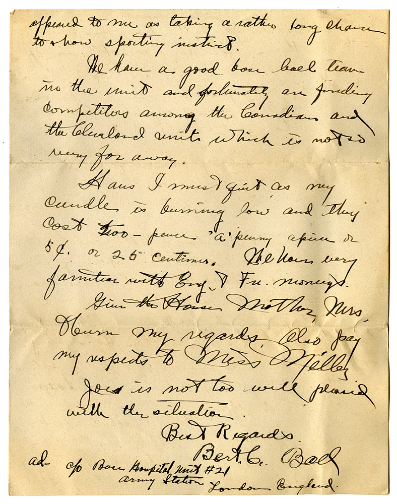 appeared to me as taking a rather long chance to show sporting instinct. We have a good base ball team in the unit and fortunately are finding competitors among the Canadians and the Cleveland units which is not so very far away. Hans I must quit as my candle is burning low and they cost two-pence 'a' penny apiece or 5 [cents] or 25 centimes. We have very [ms illegible: 1wd] with [England] & [France] moneys. Give the House Mother, Mrs. Heurn my regards. Also pay my respects to Miss Miller. Joe is not too well pleased with the situation. Best Regards. Bert. C. Ball ad- c/o Base Hospital Unit #21 Army Station London England.