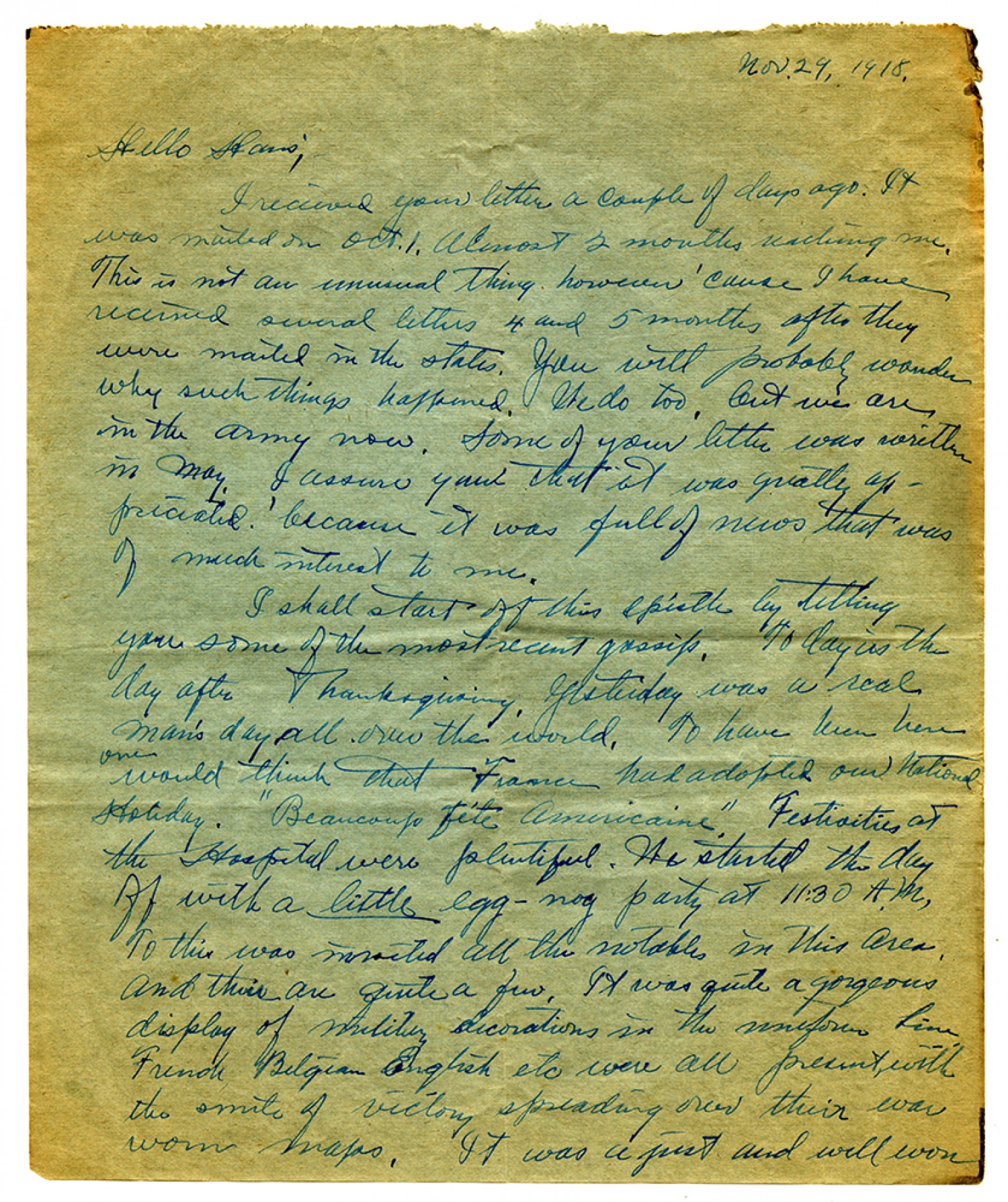 [November 29, 1918] Hello Hans; I received your letter a couple of days ago. It was mailed on [October] 1. Almost 2 months reaching me. This is not an unusual thing however 'cause I have received several letters 4 and 5 months after they were mailed in the states. You will probably wonder why such things happened. We do too, but we are in the army now. Some of your letter was written in May. I assure you that it was greatly appreciated because it was full of news that was of much interest to me. I shall start off this epistle by telling you some of the most recent gossip. Today is the day after Thanksgiving. Yesterday was a real man's day all over the world. To have been here one would think that France had adopted our National Holiday. "Beaucoup fete Americaine." Festivities at the Hospital were plentiful. We started the day off with a little egg-nog party at 11:30 A.M. To this was invited all the notables in this area and there are quite a few. It was quite a gorgeous display of military decorations in the uniform line French Belgian English etc were all present, with the smite of victory spreading over their war worn maps. It was a just and well won