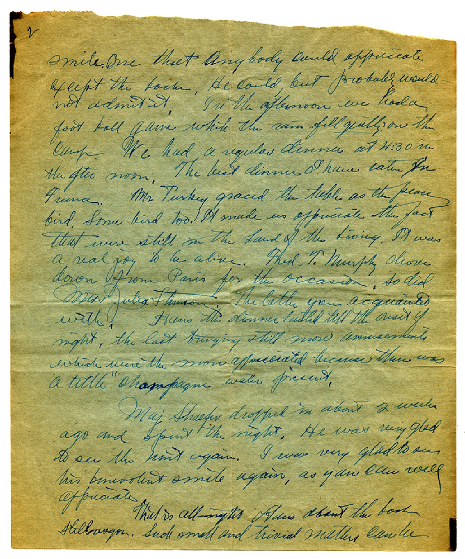 [page 2] smile. One that anybody could appreciate except the boche. He could, but probably would not admit it. In the afternoon eve had a foot ball game which the rain fell greatly on the camp. We had a regular dinner at 4:30 in the after noon. The best dinner I have eaten in France. Mr. Turkey graced the table as the peace bird. Some bird too! It made us appreciate the fact that were still in the Land of the Living. It was a real joy to be alive. Fred T. Murphy drove down from Paris for the occasion. So did Miss Julia Stinson. The latter your acquainted with. Hans the dinner lasted till the rest of night, the last bringing still more amusements which were the more appreciated because there was a little "champagne water present. Maj Shaefer dropped in about 2 weeks ago and spent the night. He was very glad to see the [ms illegible: 1 wd] again. I was very glad to see his benevolent smile again, as you can well appreciate. That is all right Hans about the book [ms illegible: 1 wd]. Such small and trivial matters can be