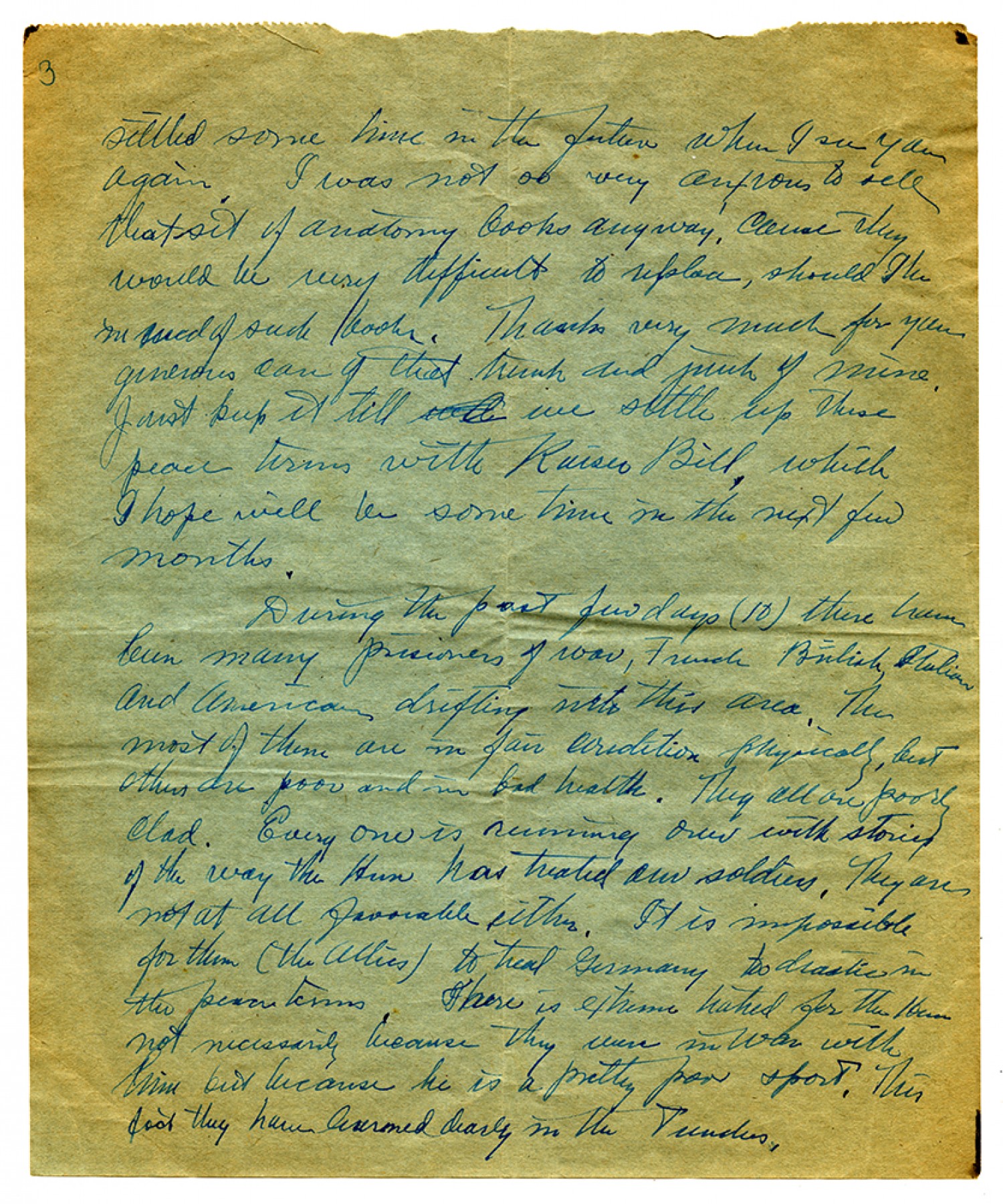 [page 3] settled some time in the future when I see you again. I was not so very anxious to sell that set of anatomy books anyway. Cause they would be very difficult to replace, should the [ms illegible: 1 wd] of such books. Thanks very much for your generous care of that trunk and junk of mine. Just keep it till we settle up these peace terms with Kaiser Bill, which I hope will be some time in the next few months. During the past few days (10) there have been many prisoners of war, French British, Italian and Americans drifting into this area. The most of them are in fair condition physically, but others are poor and in bad health. They all are poorly clad. Every one is running over with stories of the way the Hun has treated our soldiers. They are not at all favorable either. It is impossible for them (the Allies) to treat Germany too drastic in the peace terms. There is extreme hatred for the Huns not necessarily because they were in War with him but because he is a pretty poor sport. This fact they have learned dearly in the Trenches.