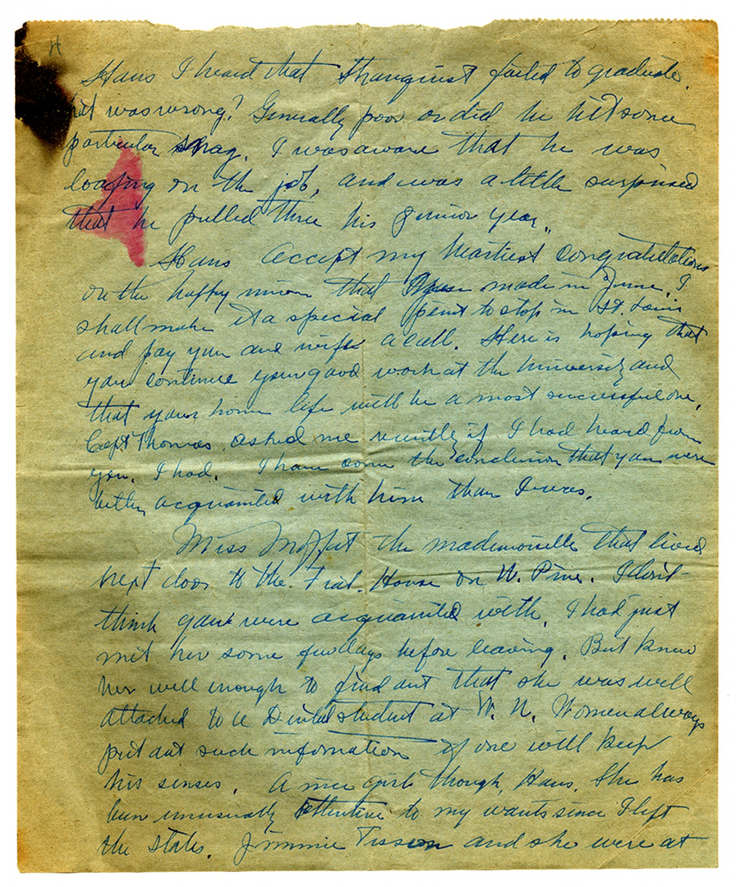 [page 4] Hans I heard that Thanquist failed to graduate but was wrong? Generally poor or did he some particular snag. I was aware that he was loafing on the job, and was a little surprised that he pulled thru his previous year. Hans accept my heartiest congratulations on the happy union that you made in June. I shall make it a special point to stop in St. Louis and pay you and wife a call. Here is hoping that you continue your good work at the university and that your home life will be a most successful one. Capt Thomas asked me recently if I had heard from you. I had. I have come to the conclusion that you were better acquainted with him than I was. Miss Moffat the mademoiselle that lived next door to the Frat. House on N. Pine. I don't think you were acquainted with. I had just met her some few days before leaving. But knew her well enough to find out that she was well attached to a Dental student at W. N. Women always put out such information if one will keep his senses. A nice girl though, Hans. she has been unusually attentive to my wants since I left the states. Jimmie Tisseon and she were at