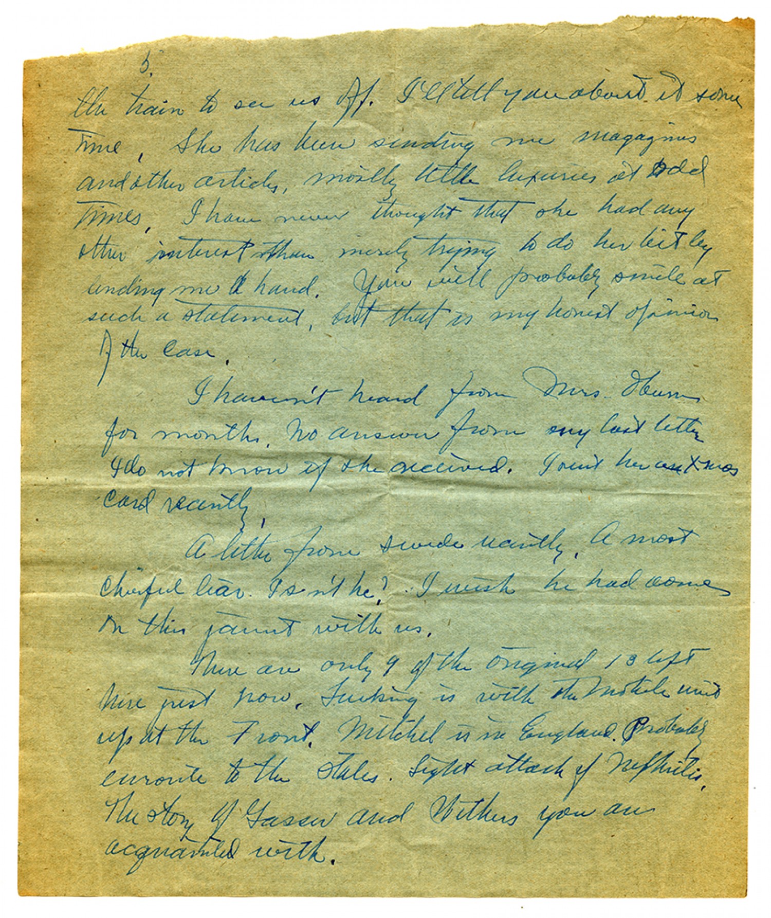 [page 5] the train to see us off. I'll tell you about it some time, She has been sending me magazines and other articles, mostly little luxuries at odd times. I have never thought that she had any other interest than merely trying to do her bit by lending me a hand. You will probably smile at such a statement, but that is my honest opinion of the case. I haven't heard from Mrs. Hume for months. No answer from any last letter I do not know if she received. [ms illegible: 1 wd] her Xmas card recently. A little from swede recently. A most cheerful liar. Isn't he? I wish he had come on this jaunt with us. There are only 9 of the original 13 left here just now. Tucking is with the Mobile unit up at the Front. Mitchell is in England. Probably enroute to the states. Light attack of Nephritis, the story of Jason and Withers you are acquainted with.
