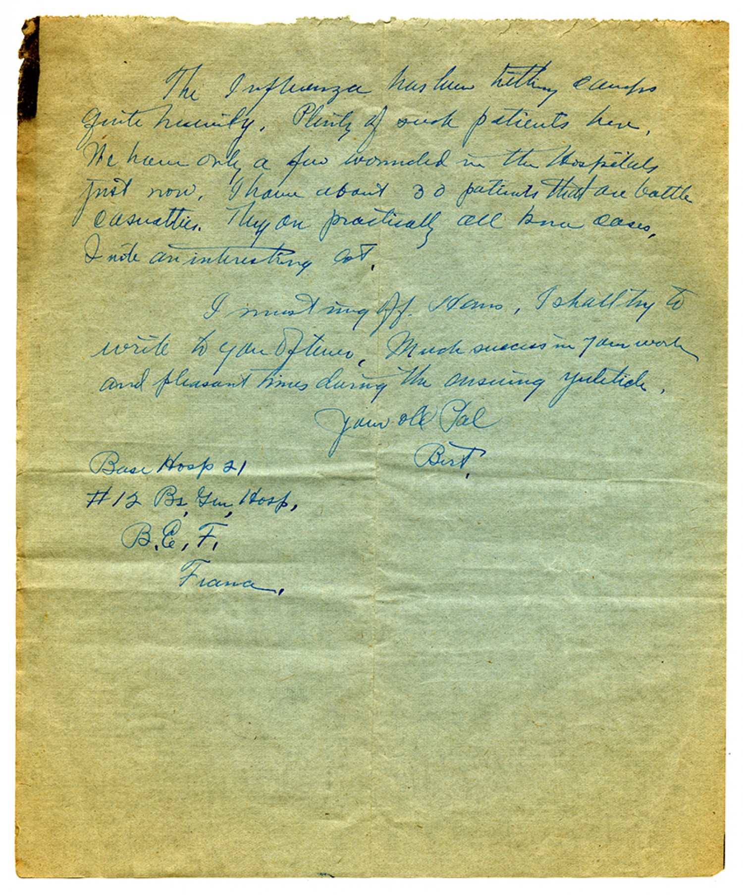 The influenza has been hitting camps quite heavily. Plenty of such patients here. We have only a few wounded in the Hospitals just now. I have about 30 patients that are battle casualties. They are practically all [ms illegible: 1 wd] cases, I note an interesting lot. I must ring off. Hans, I shall try to write you oftener. Much success in 7 am work and pleasant times during the ensuing yuletide, Your old Pal Bert. Base Hosp 21 #21 Bs. Gen, Hosp, B.E.F. France.