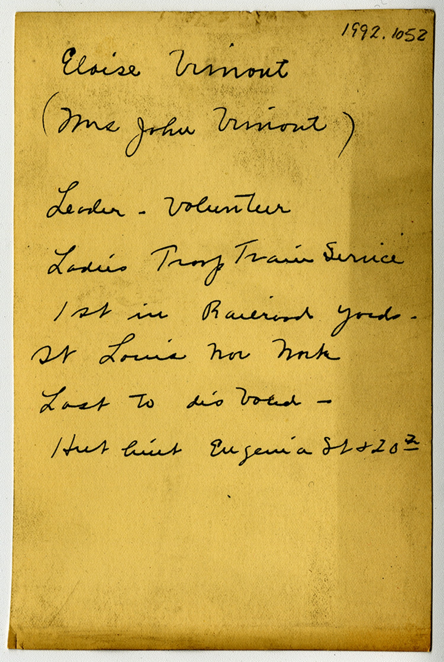 Eloise Vimont (Mrs John Vimont) Leader – Volunteer Ladies Troop Train Service 1st in Railroad yards. St. Louis [ms illegible: 1 wd] Last to disband– Hut built Eugenia St and 20th