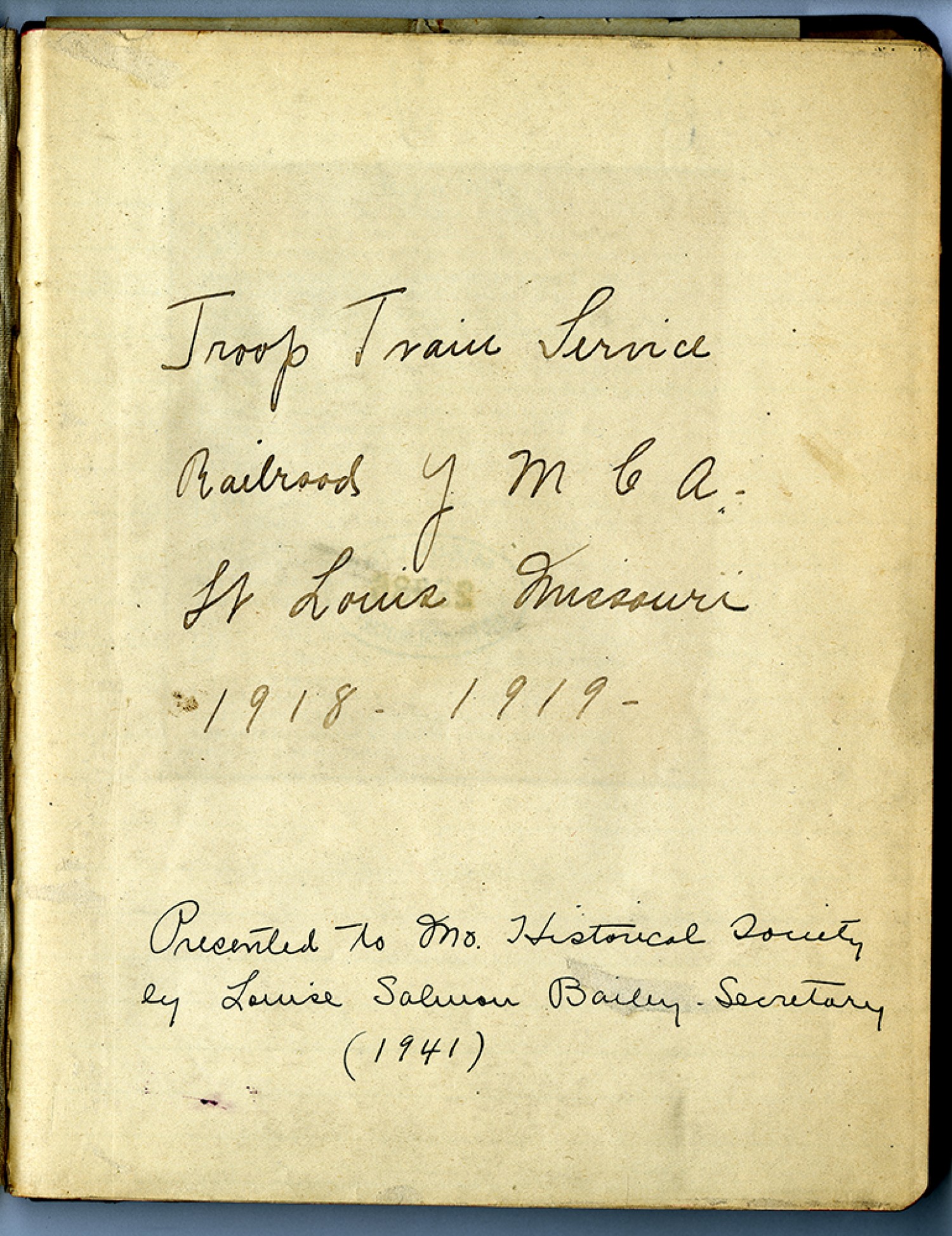 Troop Train Service Railroad Y M C A St. Louis Missouri 1918 – 1919 – Presented to [Missouri] Historical Society by Louise Salmon Bailey – Secretary (1941)