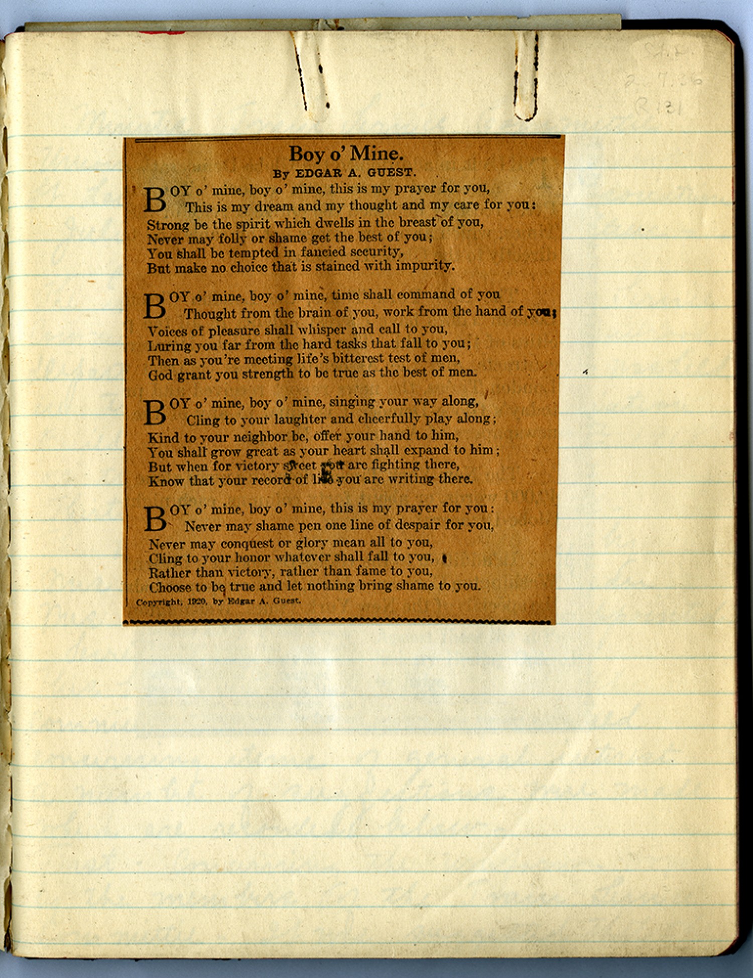 Boy o’Mine. By EDGAR A. GUEST. BOY o’ mine, boy o’mine, this is my prayer for you, This is my dream and my thought and my care for you: Strong be the spirit which dwells in the breast of you, Never may folly or shame get the best of you; You shall be tempted in fancied security, But make no choice that is stained with impurity. BOY o’ mine, time shall command of you Thought from the brain of you, work from the hand of you; Voices of pleasure shall whisper and call to you, Luring you far from the hard tasks that fall to you; Then as you’re meeting life’s bitterest test of men. BOY o’ mine, boy o’ mine singing your way along, Cling to your laughter and cheerfully play along; Kind to your neighbor be, offer your hand to him, You shall grow great as your heart shall expand to him; But when for victory sweet you are fighting there, Know what your record of life you are writing there. BOY o’mine, boy o’ mine, this is my prayer for you: Never may shame pen one line of despair for you, Never may conquest or glory mean all to you, Cling to your honor Whatever shall fall to you, Rather than victory, rather than fame to you, Choose to be true and let nothing bring shame to you. Copyright, 1920, by Edgar A. guest.