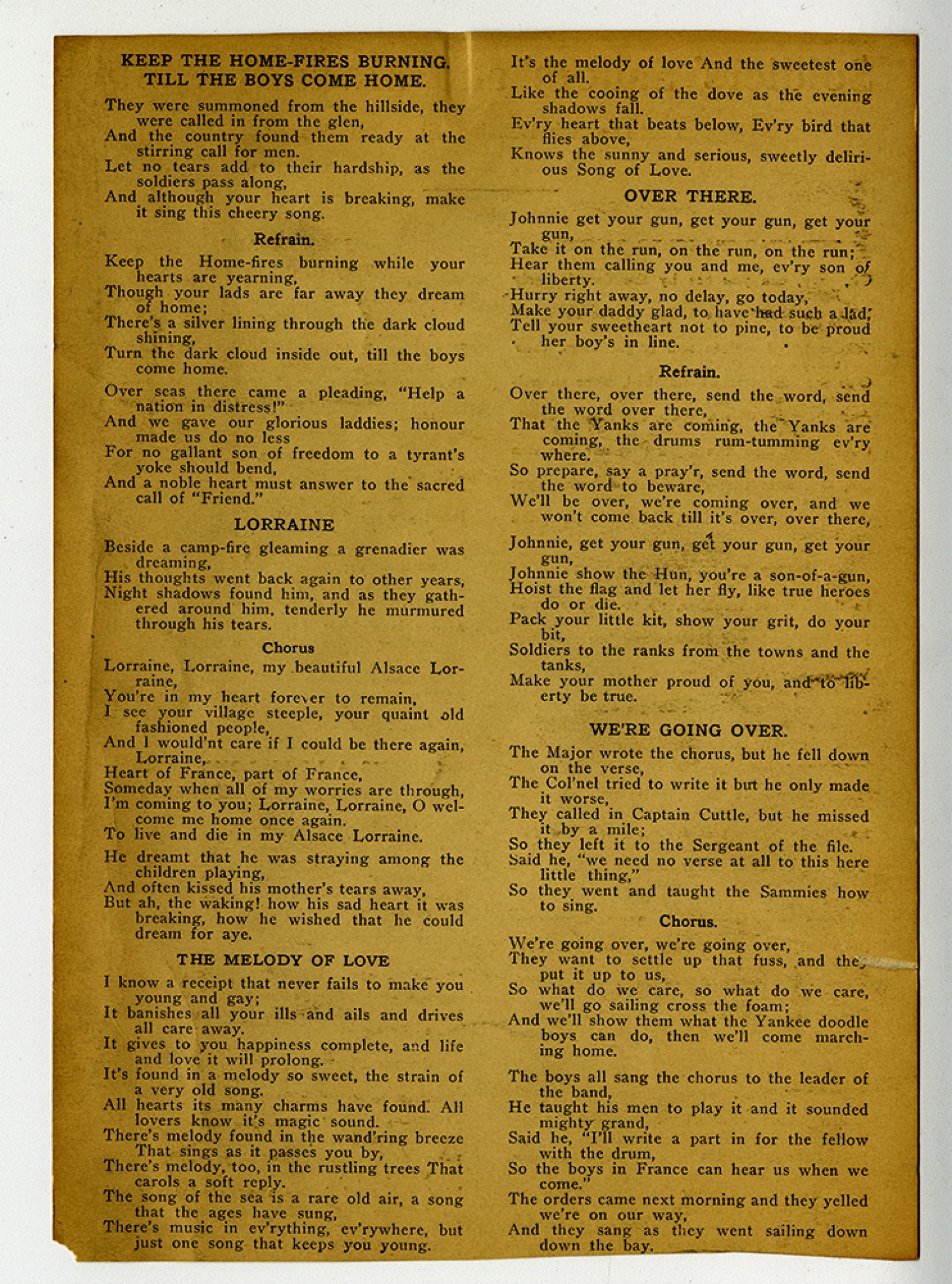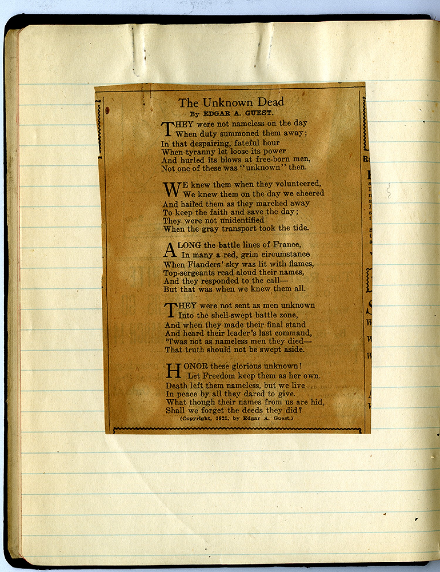 The Unknown Dead By EDGAR A. GUEST they were not nameless on the day When duty summoned them away; In that despairing, fateful hour When tyranny let loose its power And hurled its blows at free-born men, Not one of these was “unknown” then. WE knew them when they volunteered, We knew them on the day we cheered And hailed them as they marched away To keep the faith and save the day; They were not unidentified When the gray transport took the tide. ALONG battle lines of France, In many a red, grim circumstance When Flanders’ sky was lit with flames, Top-sergeants read aloud their names, And they responded to the call- But that was when we knew them all. THEY were not sent as men unknown into the shell swept battle zone, And when they made their final stand and heard their leader’s last command, ‘Twas not as nameless men they died – That truth should not be swept aside. HONOR these glorious unknown! Let Freedom keep them as her own. Death left them nameless, but we live In peace by all they dared to give. What though their names from us are hid, shall we forget the deeds they did? (Copyright, 1921, By Edgar A. Guest.)
