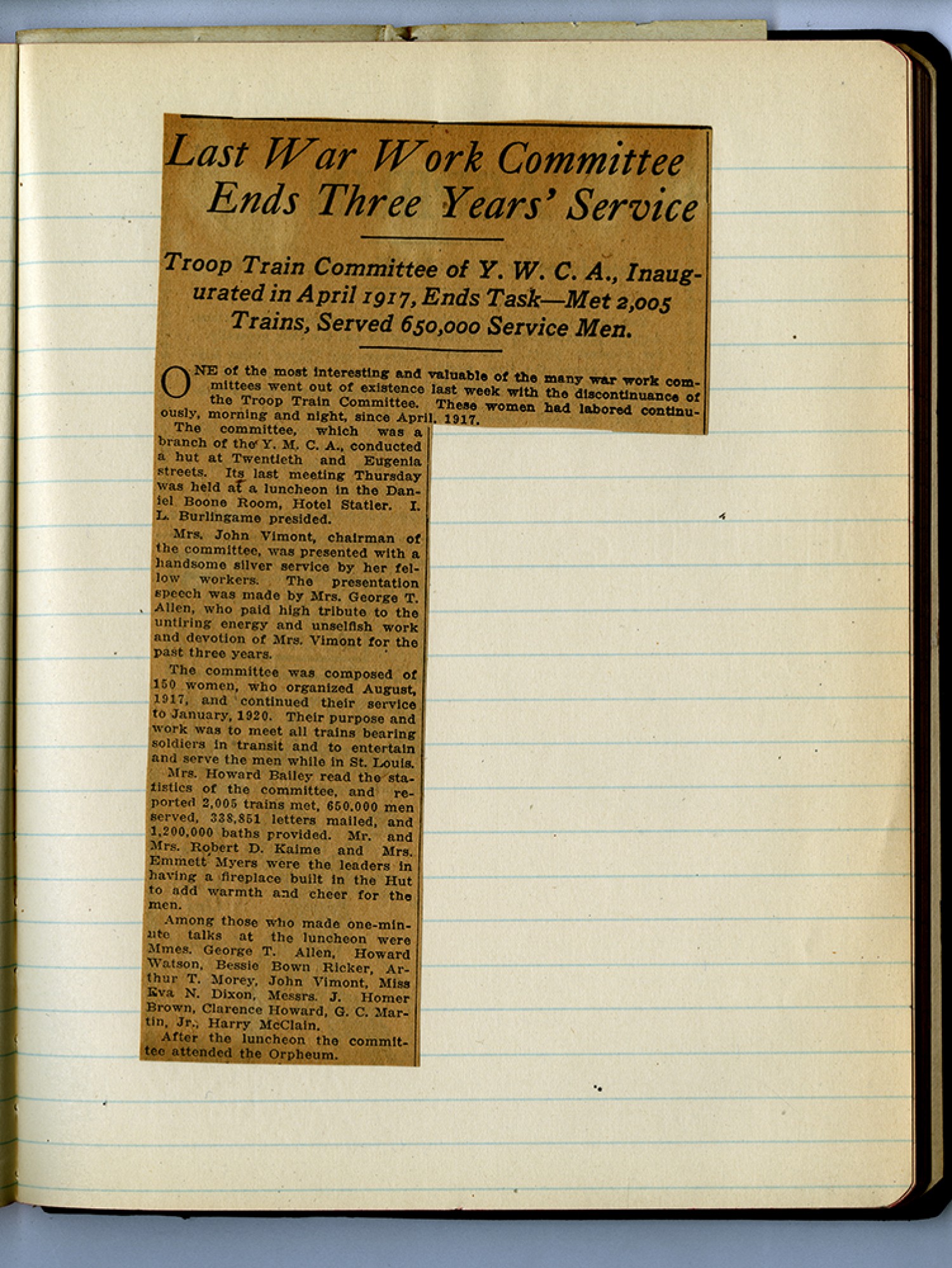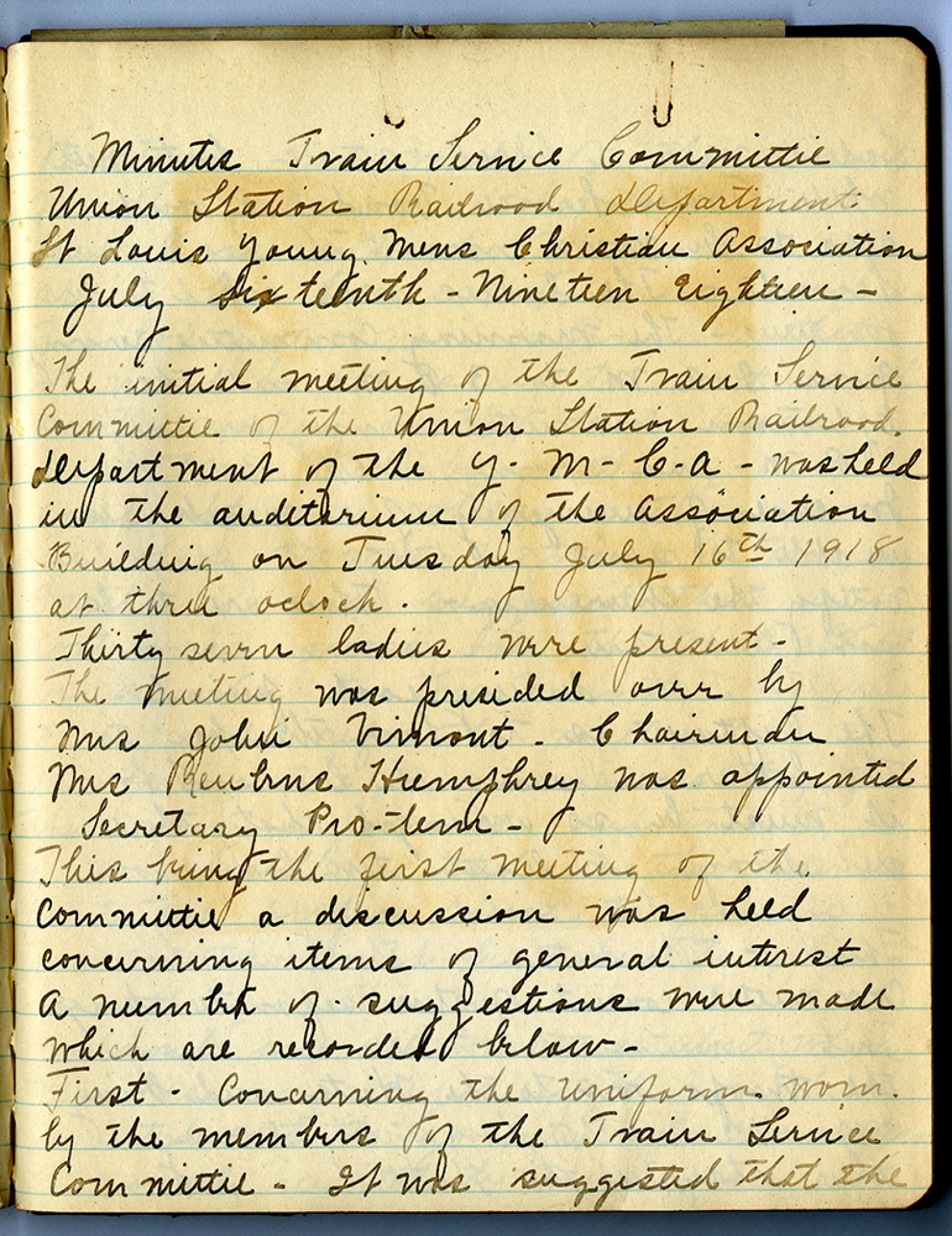 Minutes Train Service [Committee] Union Station Railroad Department: St. Louis Young Mens Christian Association [July 16, 1918] – The initial meeting of the Train Service Committee of the Union Station Railroad. Department of the Y-M-C-A- was held in the auditorium of the Association Building on Tuesday July 16th 1918 at three oclock. Thirty seven ladies were present – The meeting was presided over by Mrs. John Vimont – Chairman Mrs Reubrus Humphrey was appointed Secretary Pro-Tem- This being the first meeting of the committee a discussion was held concerning items of general interest a number of suggestions were made which are recorded below - First – concerning the uniform worn by the members of the Train Service Committee - It was suggested that the