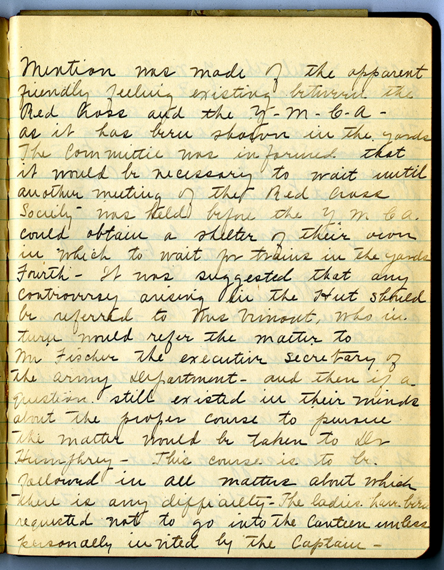Mention was made of the apparent friendly feeling existing between the Red Cross and the Y-M-C-A- as it has been shown in the yards The Committee was informed that it would be necessary to wait until another meeting of the Red Cross Society was held before the YMCA could obtain a shelter of their own in which to wait for trains in the yards Fourth – It was suggested that any controversy arising in the Hut should be referred to Mrs. Vimont, who in turn would refer the matter to Mr. Fischer the executive secretary of the Army Department - and then if a question still existed in their minds about the proper course to pursue the matter would be taken to Dr. Humphrey - This course is to be followed in all matters about which there is any difficulty – The ladies have been requested not to go in the canteen unless personally incited by the Captain -