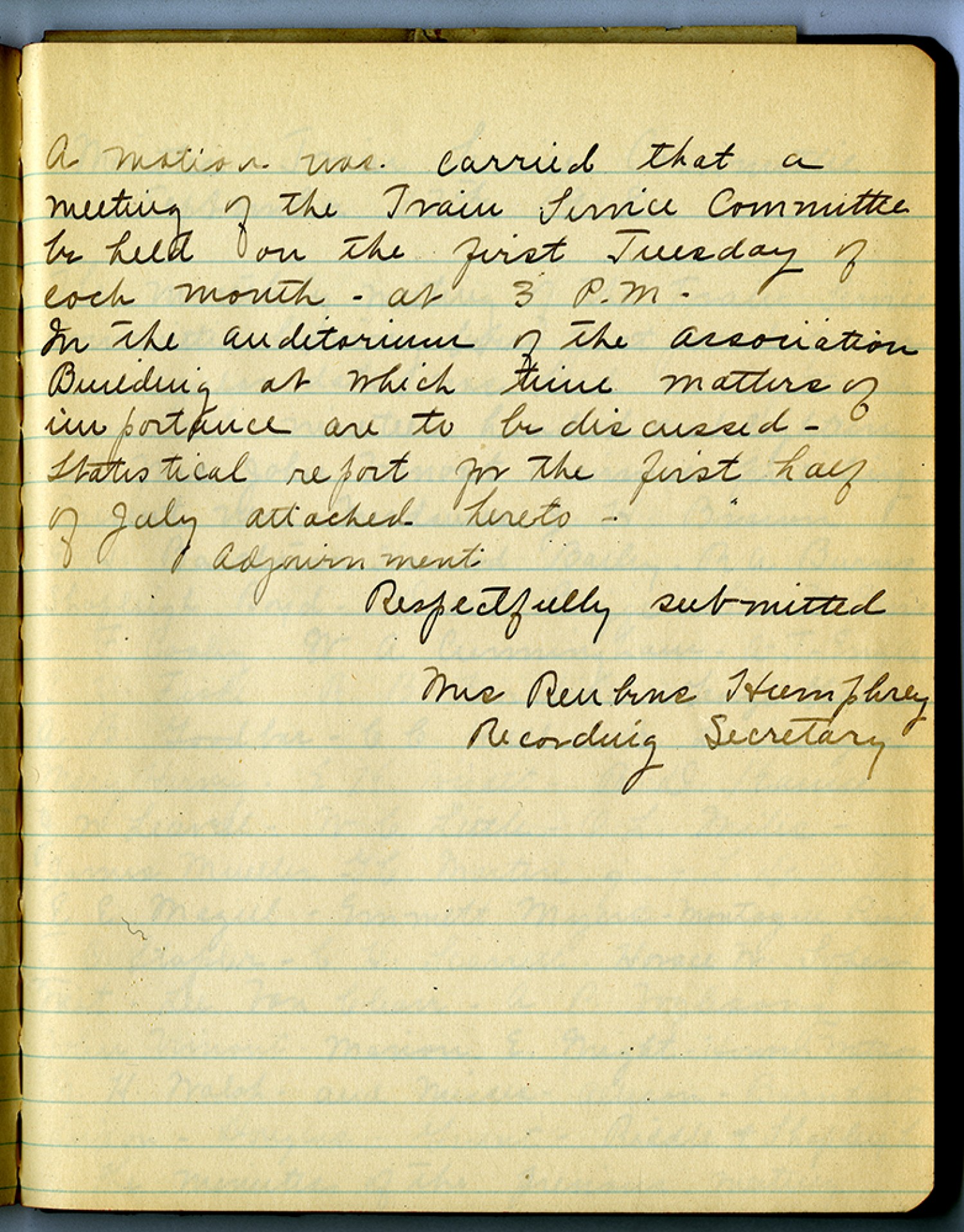 A motion was carried that a meeting of the Train Service Committee be held on the first Tuesday of each month – at 3P.M. In the auditorium of the Association Building at which time matters of importance are to be discussed – Statistical report for the first half of July attached hereto – Adjournment Respectfully submitted Mrs. Reubens Humphrey Recording Secretary