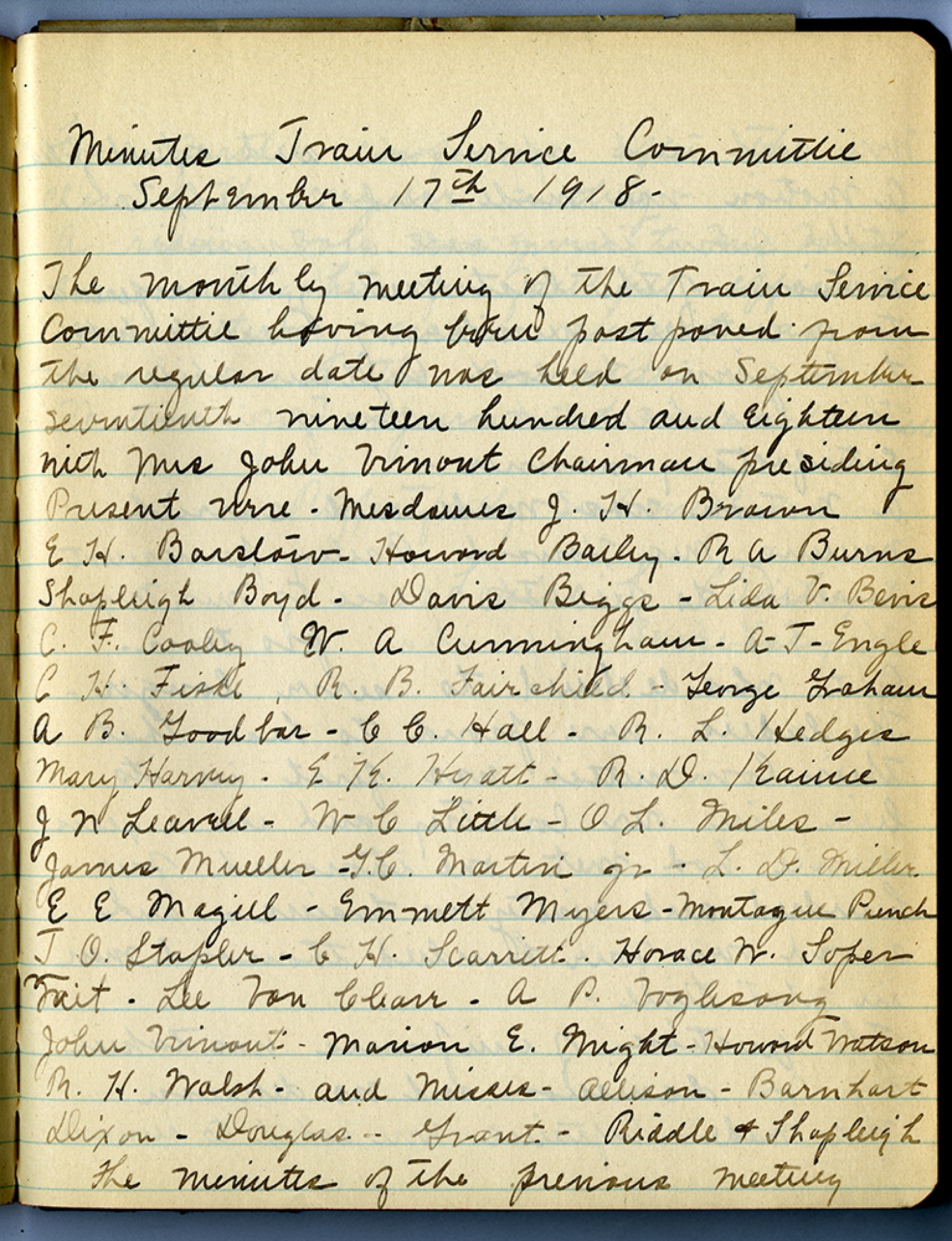 Minutes Train Service [Committee] September 17th 1918. The monthly meeting of the Train Service [Committee] having been postponed from the regular date was held on September seventeenth nineteen hundred and eighteen with Mrs. Kohn Vimont Chairman presiding Present were Mesdames J. H. Brown E. H. Barstow – Howard Bailey. R A Burns Shopleigh Boyd. Davis Biggs – Lida V. Bevis C.F. Cooley W.A Cunningham. A. J. Engle C H Fische, R. B. Fairchild – George Graham A B. Goodbar – C. C. Hall. R. L. Hedges Mary Harvey – E K. Hyatt – R. D. Kaine J N Leavell – W C Little – O L. Miles – James Meuller - G. C. Martin jr – L. D. Miller E E Magill – Emmett Myers – Montague Punch T. O. Stapler – C H. Scarritt. Horace W. Loper Fait – Lee Von Charr – A P. Voglesong John Vimont – Marion E Wright – Howard Watson M. H. Walsh – and Wiscus – Allison – Barnhart Dixon – Douglas – Grant – Riddle & Thapliegh The Minutes of the previous meeting