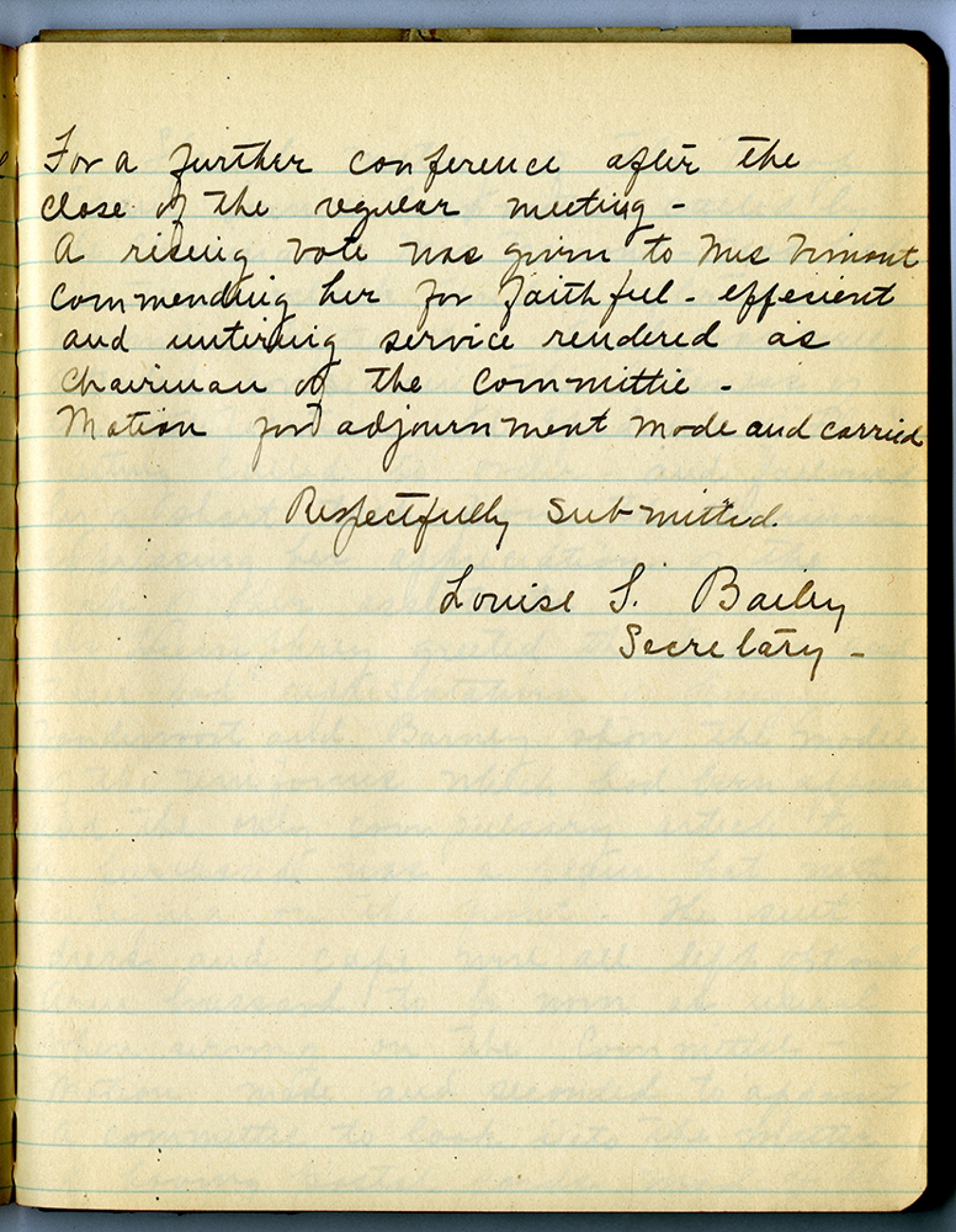For a further conference after the close of the regular meeting – a rising vote was given to Mrs Vimont commending her for faithful – efficient and untiring service rendered as Chairman of the [committee] – Motion for adjournement made and carried Respectfully submitted Louis L. Bailey Secretary