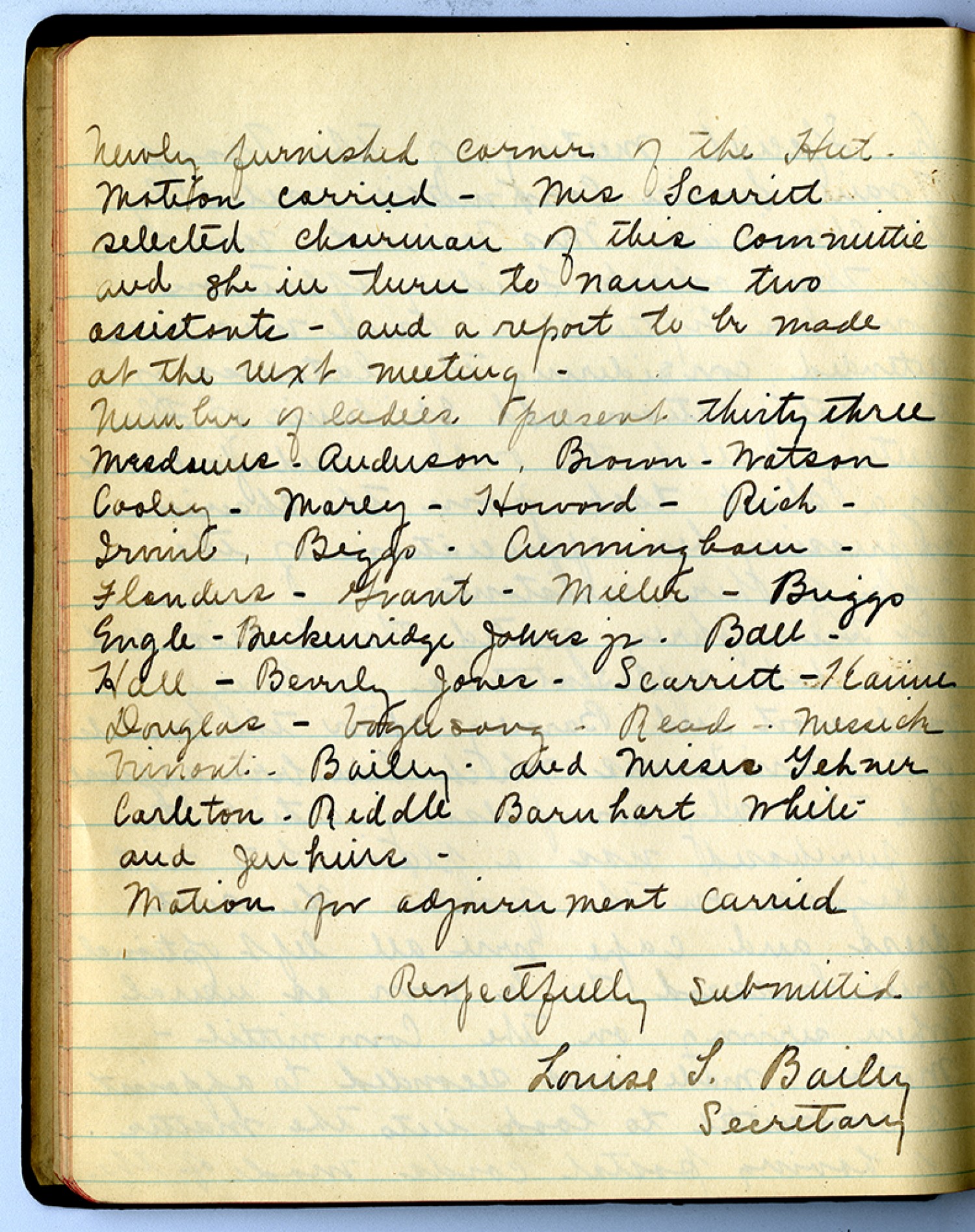 Newly furnished corner of the Hut. Motion carried – Mrs. Scarritt selected chairman of this [committee] and she in turn to name two assistants – and a report to be made at the next meeting – Number of ladies present thirty three Mesdames – Anderson, Brown – Watson Cooley – Morey – Howard – Rich – Irvin – Biggo – Cunningham – Flanders – Grant – Mieler – Buggo Engle – Breckenridge Jones jr. Ball – Hall – Beverly Jones – Scarritt – Karine Douglas – Vooglesong- Read – Messich Vrinot – Bailey- and Misses Gehner Carleton – Riddle Barnhart White and Henhire – Motion for adjournment carried Respectfully submitted Louise S. Bailey Secretary
