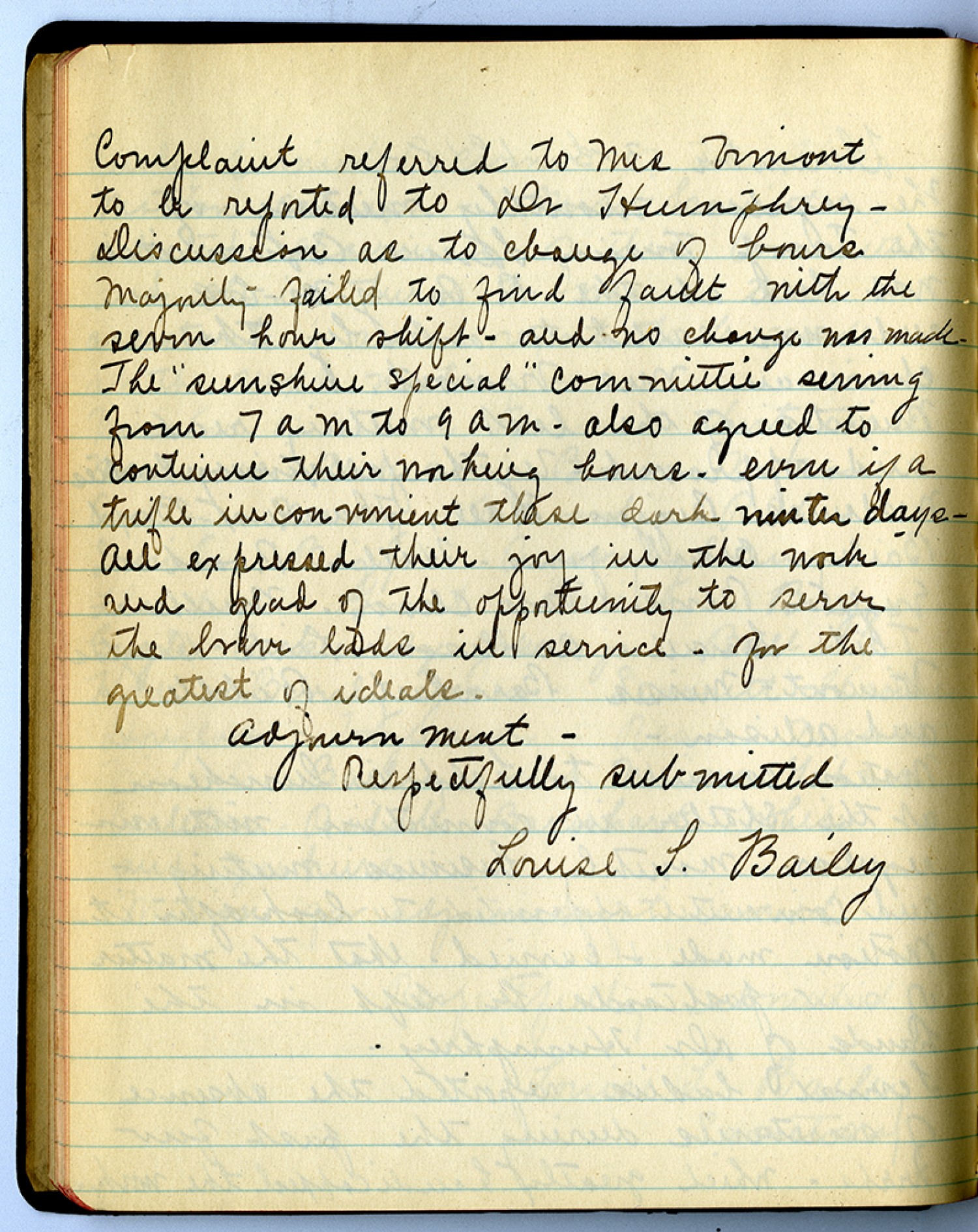 Complaint referred to Mrs. Vimont to be reported to Dr. Humphrey – Discussion as to change of hours majority failed to find fault with the seven hour shift – and no change was made - The “sunshine special” Committee serving from 7 a m to 9 a m – also agree to continue their morning hours – even if a trifle inconvenient these dark winter days - All expressed their joy on the work and glad of the opportunity to serve the brave lads in service – for the greatest ideals Adjournment – Respectfully submitted Louise S. Bailey