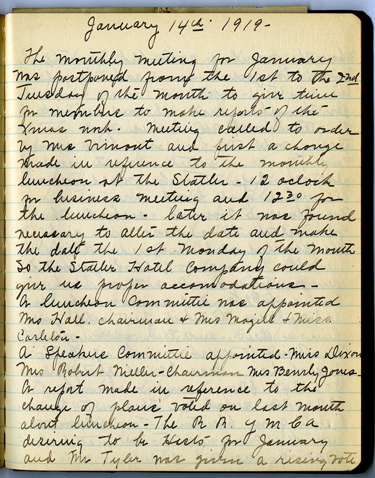 January 14th 1919 - The monthly meeting for January was postponed from the 1st to the 2nd Tuesday of the month to give time for members to make reports of the Xmas work. Meeting called to order by Mrs. Vimont and first a change made in reference to the monthly luncheon at the Statler – 12 oclock in business meeting and 1230 for the luncheon – later it was found necessary to alter the date and make the date the 1st Monday of the month so the Statler Hotel Company could give us proper accomodations – a luncheon committee was appointed Ms Hall chairman & Mrs Magill & Miss. Carleton. A Speakers [committee] appointed – Miss Dixon Mrs Robert Miller – Chairman Mrs. Beverly Jones. A report made in reference to the change of plans voted on last month about luncheon – The R.R. YMCA desiring to be Hosts for January and Mr Tyler was given a rising vote