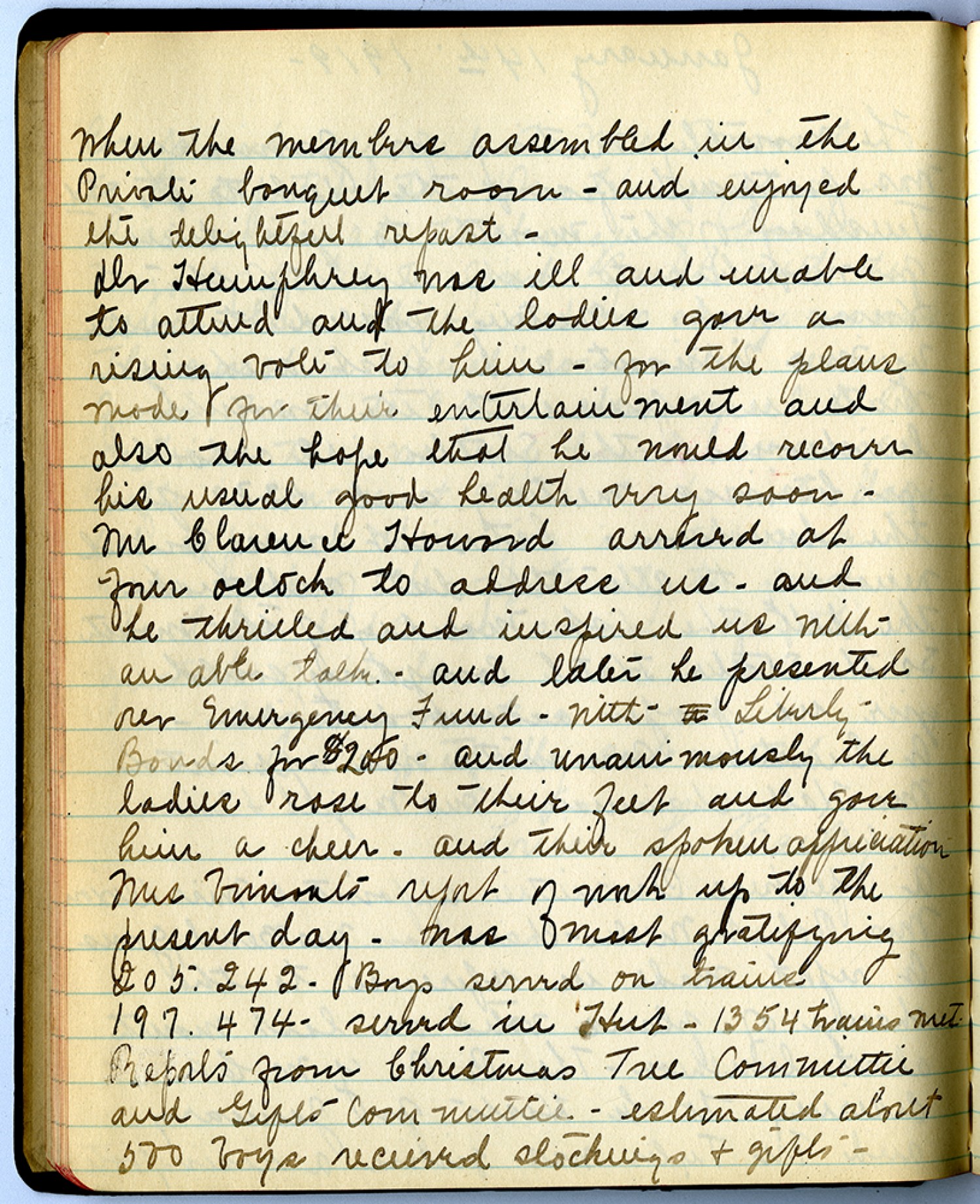 When the members assembled in the Private banquet room – and enjoyed the delightful repast - Dr. Humphrey was ill and unable to attend and the ladies gave a rising vote to him – for the plans made for their entertainment and also the hope that he would recover his usual good health very soon – Mr Clarence Howard arrived at four oclock to address us – and he thrilled and inspired us with an able talk – and later he presented our Emergency Fund - with Liberty Bonds for $100 - and unanimously the ladies rose to their feet and gave him a cheer - and their spoken appreciation Mrs Vimont’s report of work up to the present day – was most gratifying 205.242 – Boys served on trains 197.474 –served in Hut – 1354 trains met. Reports from Christmas Tree Committee and Gifts Committee – estimated about 500 boys received stockings & gifts –