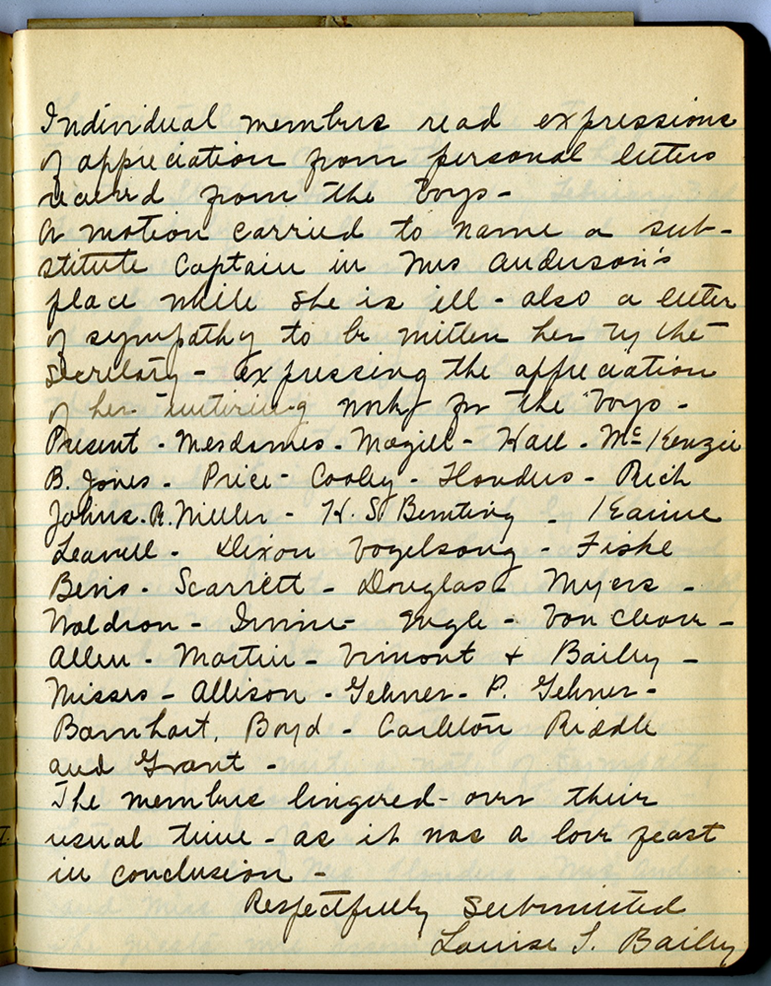 Individual members read expressions of appreciation from personal letters received from the boys - A motion carried to name a substitute Captain in Mrs. Anderson’s place while she is ill – also a letter of sympathy to be written her by the secretary – expressing the appreciation of her untiring work for the boys – Present – Mesdames – Mazill – Hall – McKenzii B. Jones – Price – Cooley – Flanders – Rich Johns – A, Miller – H.S. Benting – Keanine Leavell – Dixon Vogelsong – Fishe Bens – Scarrett – Douglas – Myers Waldron – Irnni – Vogle – Von Cleaver – Allen – Martin – Vimont and Bailey – Missrs – Allison – Gelnes – P. Gelnes – Batnhard, Boyd – Carleton Riddle and Grant – The mentors lingered – over their usual time – as it was a love feast in conclusion – Respectfully Submitted Louise S. Bailey