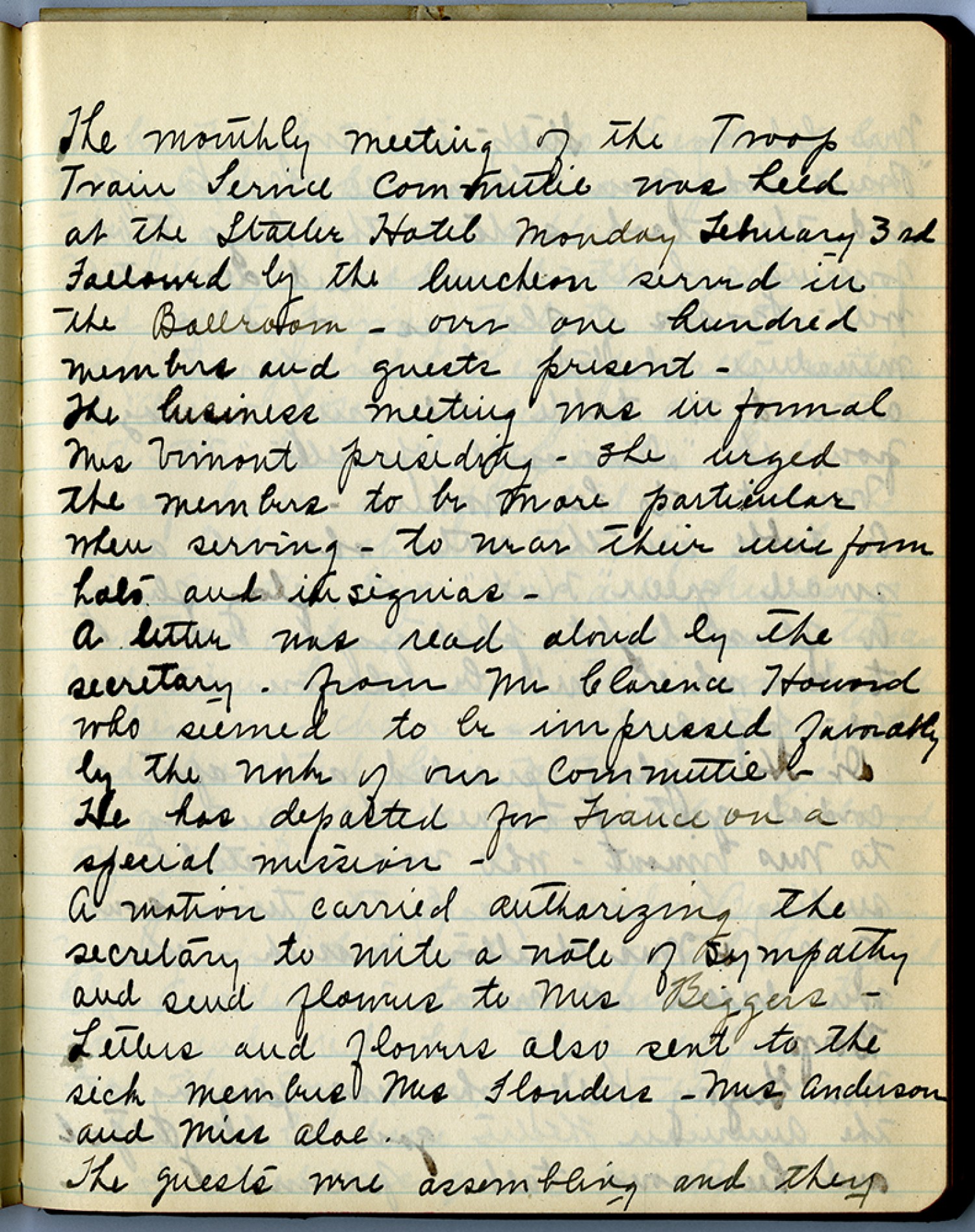 The monthly meeting of the troop Train Service [Committee] was held at the Statler Hotel Monday February 3rd [1919] Followed by the luncheon served in the Ballroom – over one hundred members and guests present – The business meeting was informal Mrs Vimont presiding – she urged the members to be more particular when serving – to wear their uniform hats and insignias – A letter was read aloud by the secretary – from Mr. Clarence Howard who seemed to be impressed favorably by the work of our [committee] – He has departed for France on a special mission – A motion carried authorizing the secretary to write a note of sympathy and send flowers to Mrs. Biggers – Letters and flowers also sent to the sick members Mrs Flonders – Mrs Anderson and Miss Aloe. The guests were assembling and they