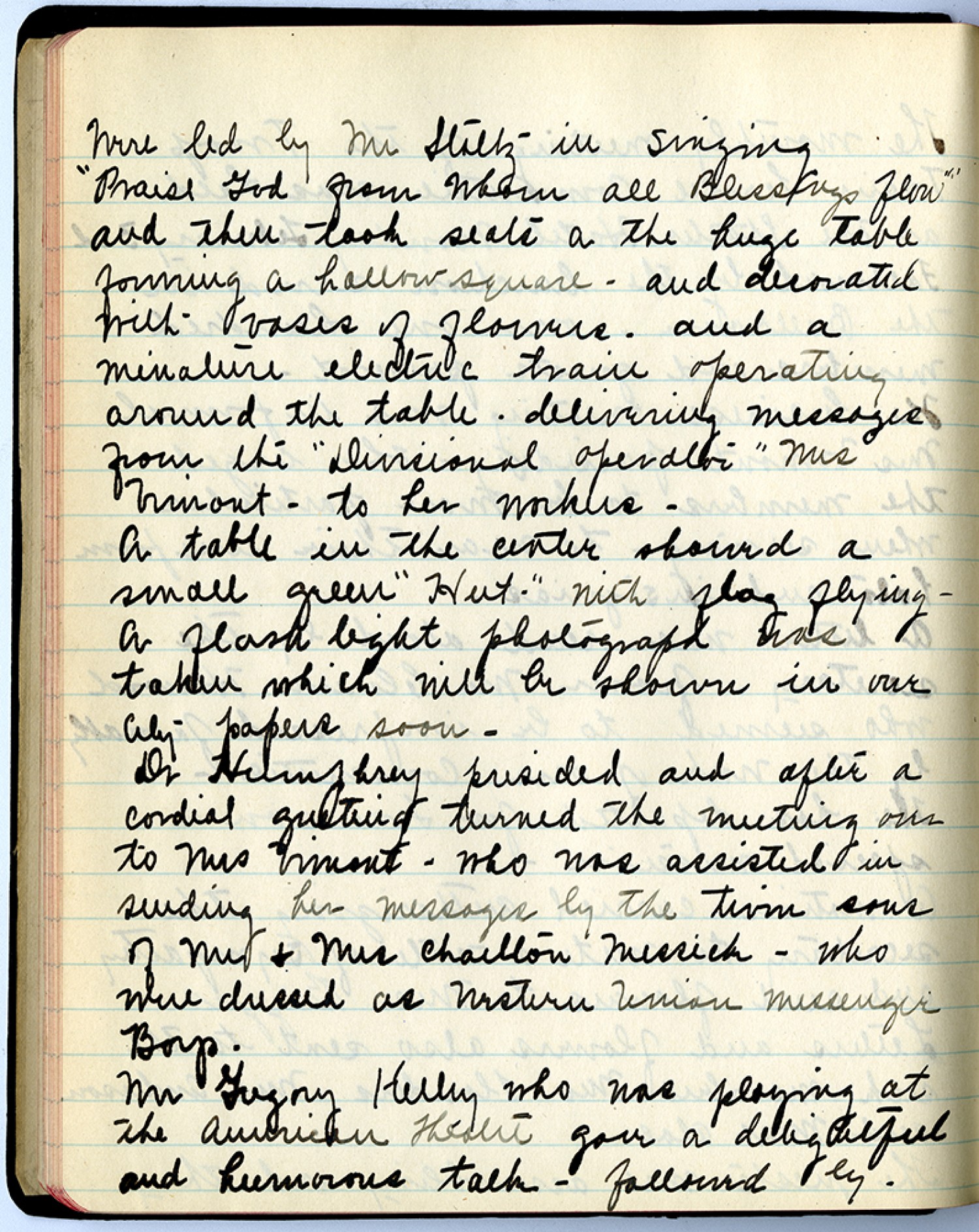 Were led by Mr. Staltz in singing “Praise God from Whom all Blessings flow” and then took seats a the huge table forming a hollow square – and decorated with vases of flowers – and a minature electric train operating around the table. delivering messages from the “Divisional Operator” Mrs Vimont – to her workers – A table in the center showed a small green “Hut” With flag flying – A flash light photograph was taken which will be shown in our city papers soon – Dr. Humphrey presided and after a cordial greeting turned the meeting over to Mrs. Vimont – who was assisted in sending hes messages by the twin sons of Mr. and Mrs. Chailton Messich – who were dressed as Western Union Messenger Boys. Mr. Gregory Kelley who was playing at the American Theatre gave a delightful and humorous talk – followed by –