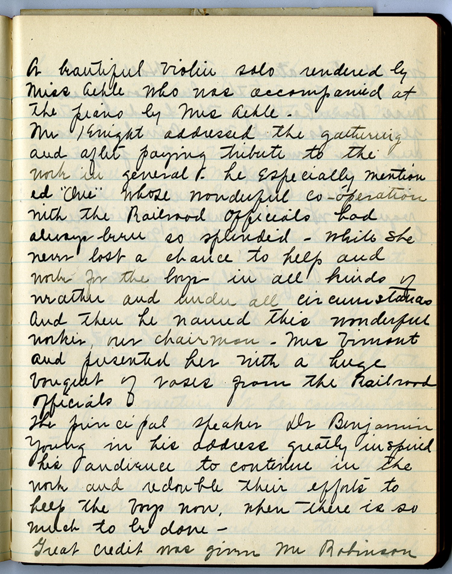 A beautiful violin solo rendered by Miss Achle who was accompanied at the piano by Mrs Achle – Mr Knight addressed the gathering and after paying tribute to the work in general - he especially mentioned “Clue” Whose wonderful co-operation With the Railroad Officials had always been so splendid – While she never lost a chance to help and work for the boys in all kinds of weather and under all circumstances and then he named this wonderful worker, our chairman – Mrs Vimont and presented her with a huge bouquet of roses from the railroad officials The principal speaker Dr. Benjamin Young in his address greatly inspired his audience to continue in the work and redouble their efforts to keep the boys now. When there is so much to be done – Great credit was given Mr Robinson