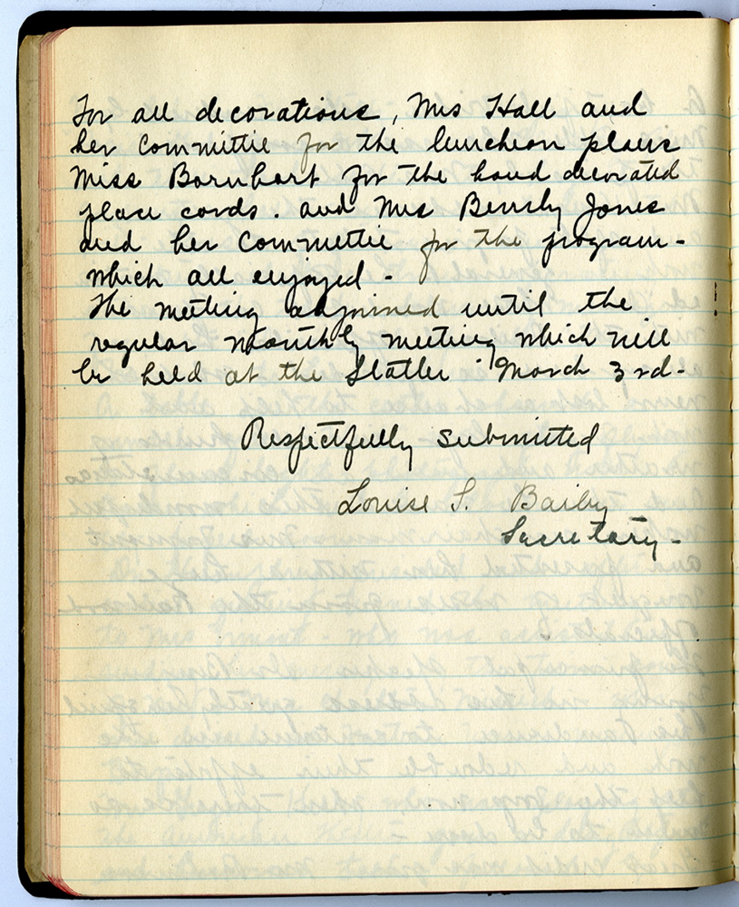 For all decorations, Mrs Hall and her committee for the luncheon plans Miss Barnhart for the hand decorated place cards. and Mrs Bevely Jones and her [committee] for the program – which all enjoyed – the meeting adjourned until the regular monthly meeting which will be held at the Statler – March 3rd Respectfully Submitted Louis L. Bailey Secretary -