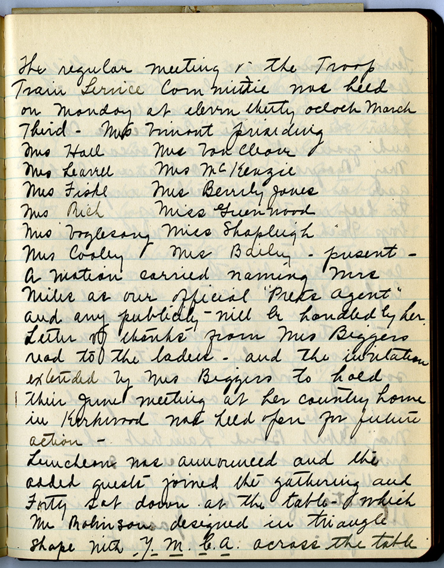 The regular Meeting of The Troop Train Service [Committee] was held on Monday at eleven thirty oclock [March 3, 1919] – Mrs Vimont presiding Mrs Hall Mrs Von Cleave Mrs Leavree Mrs McKenzie Mrs Fishe Mrs Bevrly Jones Mrs Rich Miss Greenwood Mrs Voglesong Mrs Shapliegh Mrs Cosley Mrs Bailey –present - A motion carried naming Mrs Miles as our official “Press Agent” and any publicity – will be handled by her Letter of thanks from Mrs Biggers read to the ladies – and the invitation extended by Mrs. Biggers to hold their June meeting at her country home in Kirkwood [Missouri] was held open for future action – Luncheon was announced and the added guests joined the gathering and forty sat down at the table – which Mr. Robinson designed in triangle shape with Y.M.C.A. across the table