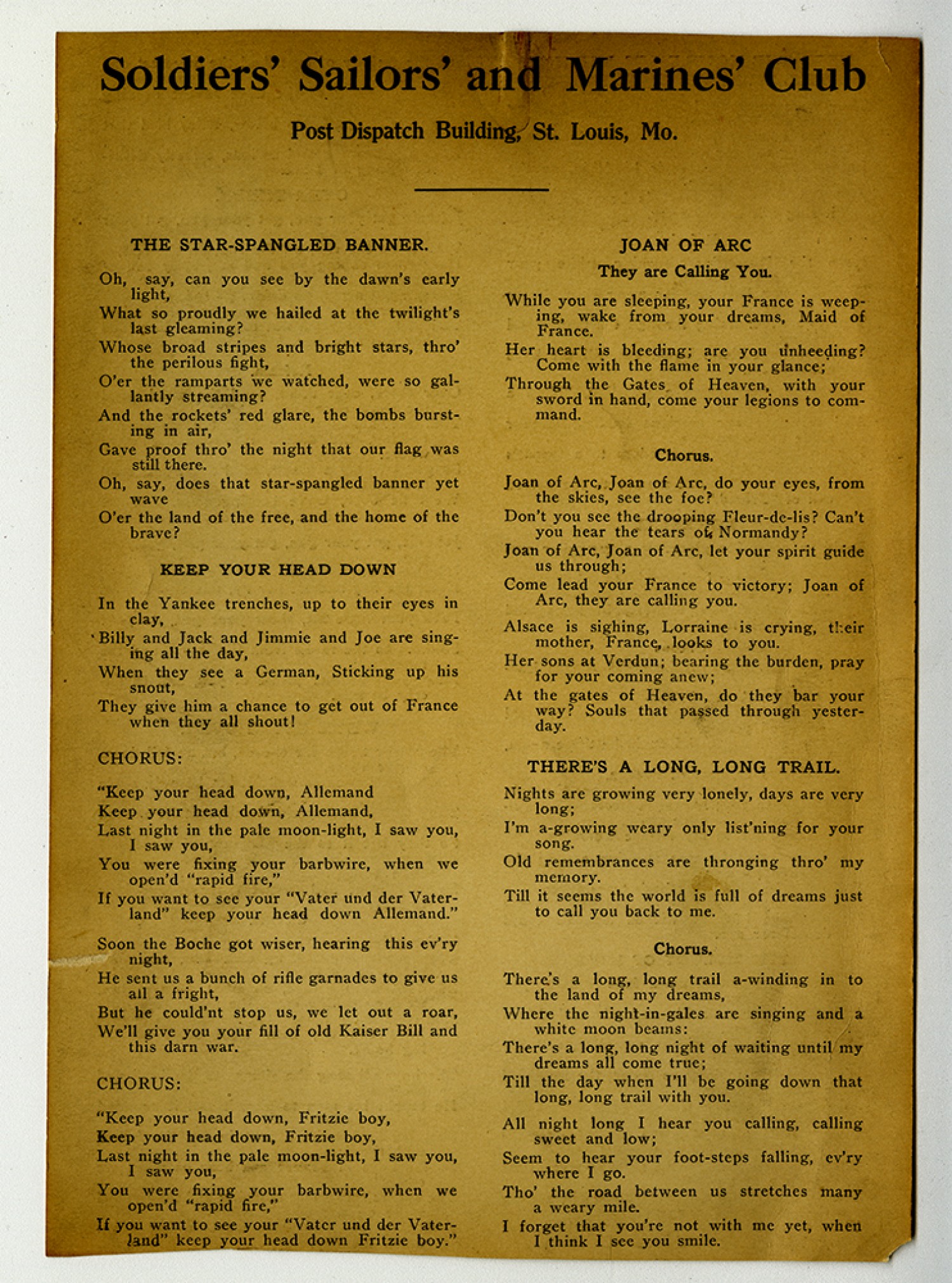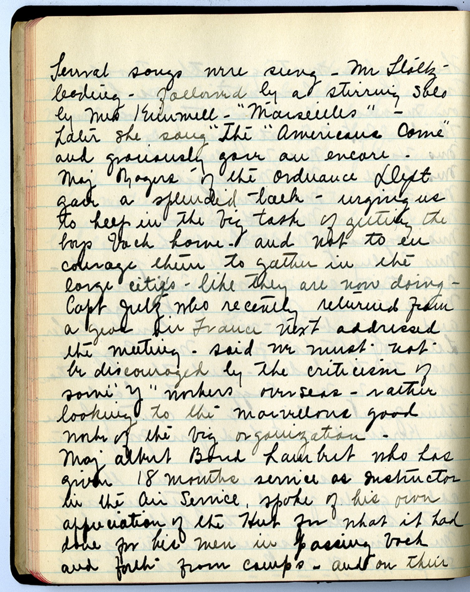 Several songs were sung – Mr Staltz – leading – followed by a stirring solo by Mrs. Kimmell – “Marseilles” - Later she sang “The “Americans Come” and graciously gave an encore – Maj Rogers of the Ordinance Dept gave a splendid talk – urging us to help in the big task of getting the boys back home and not to encourage them to gather in the large cities – like they are now doing – Capt Julz who recently returned from a year in France next addressed the meeting – said we must not be discouraged by the criticism of some “Y” workers overseas – rather looking to the marvellous good works of the big organization – Maj Albert Bond Lambrit who has given 18 months service as Instructor in the Air Service, spoke of his own appreciation of the Hut for what it had done for his men in passing back and forth from camps – and on their