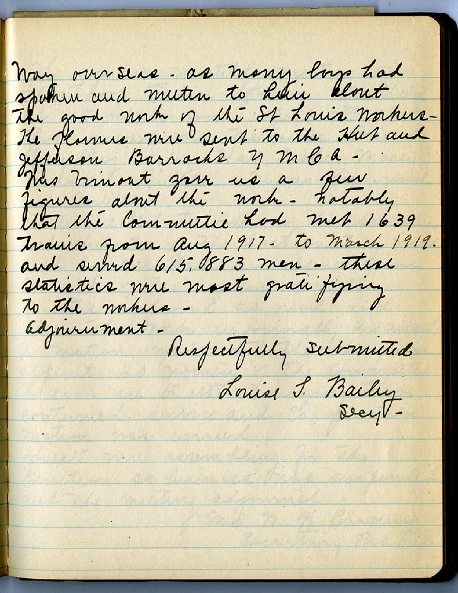 Way overseas – as many boys had spoken and written to him about the good works of the St. Louis [Missouri] Workers - The flowers were sent to the Hut and Jefferson Barracks YMCA – Mrs. Vimont gave us a few figures about the work – notable that the [committee] had met 1639 trains from [August] 1917 to March 1919. and served 615,883 Men – these statistics were most gratifying to the workers – adjournment – Respectfully submitted Louis S. Bailey Secy-