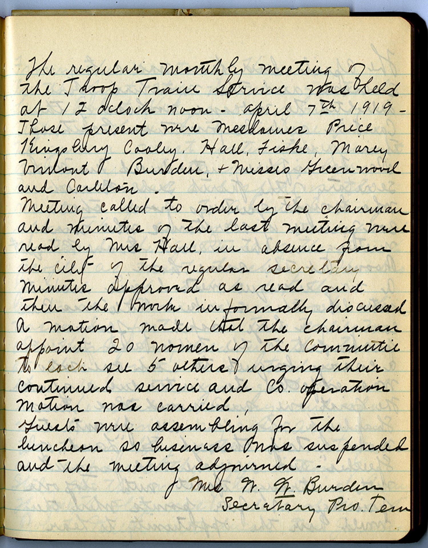 The regular monthly meeting of the Troop Train Service was held at 12 oclock noon – April 7th 1919 – Those present were Mesdames Price Kingsbury Cooley, Hall,Fishe, Marcy Vimont Burden, & Misses Greenwood and Carleton. Meeting called to order by chairman and minute of the last meeting were read by Mrs. Hall in absence from the city of the regular secretary minutes approved as read and then the work informally discussed A motion made that the chairman appoint 20 women of the [committee] to each sec 5 others urging their continued service and Co. operation Motion was carried Guests were assembling for the luncheon so business was suspended and the meeting adjourned Mrs. W. W. Burden Secretary Pro. Tem