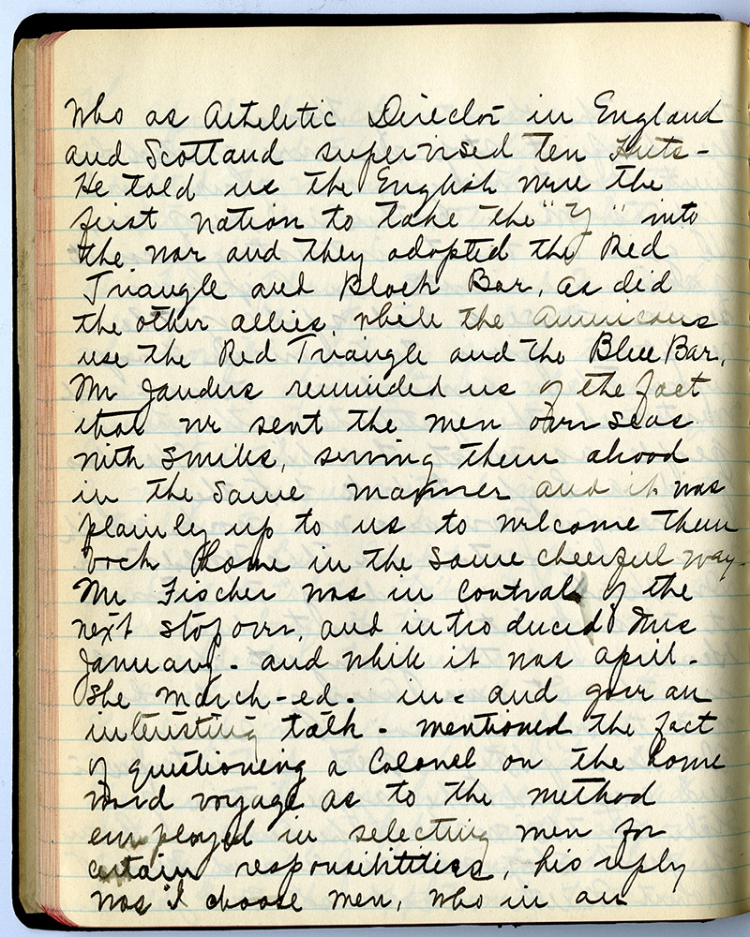 Who as Athletic Director in England and Scotland supervised ten huts – He told us the English were the first nation to take the “Y” into the war and they adopted the Red Triangle and Black Bar, as did the other Allies, while the Americans use the Red Triangle and the Blue Bar, Mr Janders reminded us of the fact that we sent the men overseas with smiles, serving them abroad in same manner and it was plainly up to us to welcome them back home in the same cheerful way. Mr. Fisher was in control of the next stop over and introduced Mrs January – and while it was April – she March-ed – in –and gave an interesting talk – mentioned the fact of questioning a Colonel on the home ward voyage as to the method employed in selecting men for certain responsibilities, his reply was I choose men who in an
