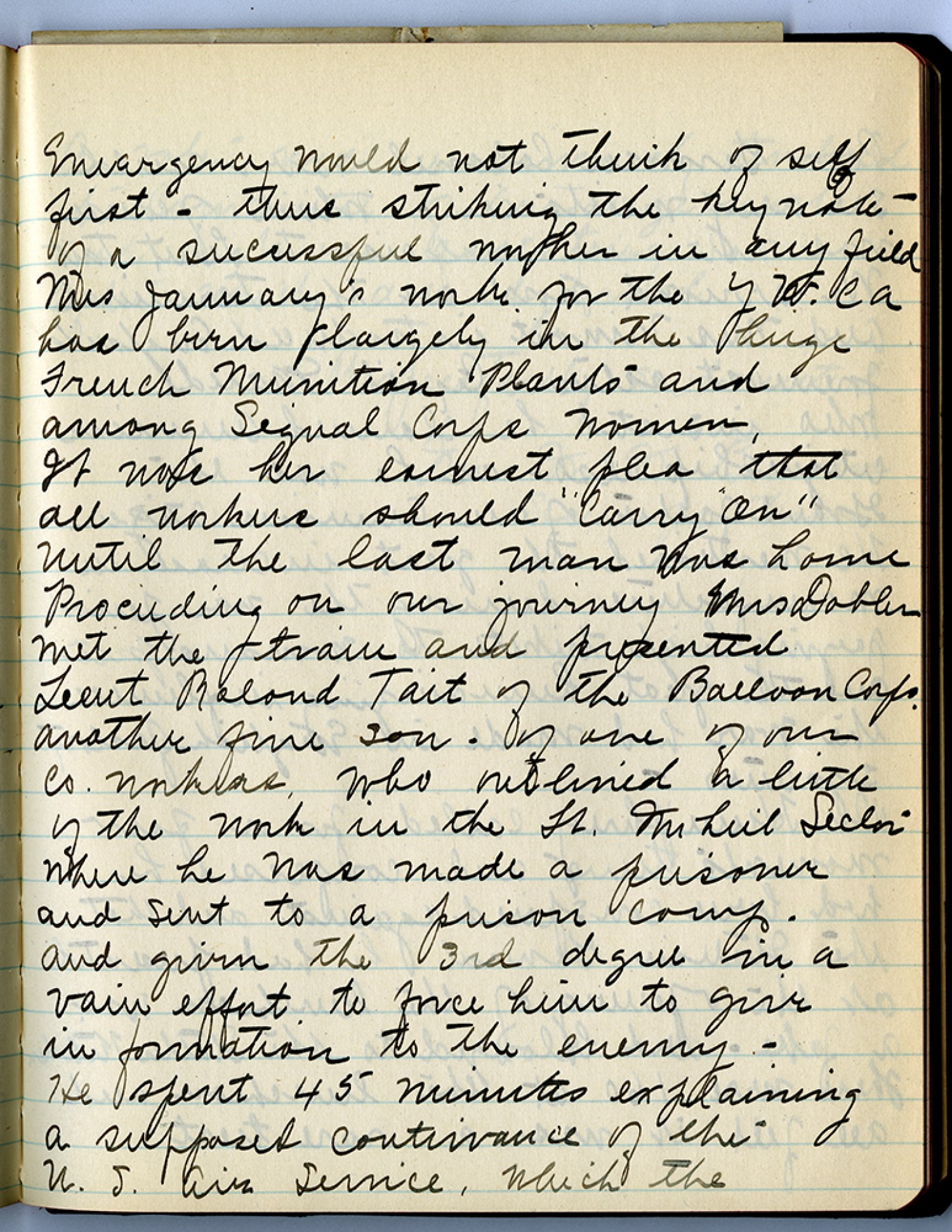 Emergency would not think of self first – thus striking the key note – of a successful [ms illegible: 1wd] in any field Mrs. January’s work for the YW.CA has been largely in the huge French Munition Plants and among Signal Corps Women, It was her earnest plea that all workers should “Carry On” Until the last man was home Proceeding on our journey Mrs Dobler met the train and presented Lieut Roland Tait of the Balloon Corps, Another fine son. of one of our Co. workers who outlined a little of the work in the St. Miheil Sector where he was made a prisoner and sent to a prison camp and given the 3rd degree in a vain effort to force him to give in formation to the enemy – He spent 45 minutes explaining a supposed contrivance of the U.S. Air Service, which the