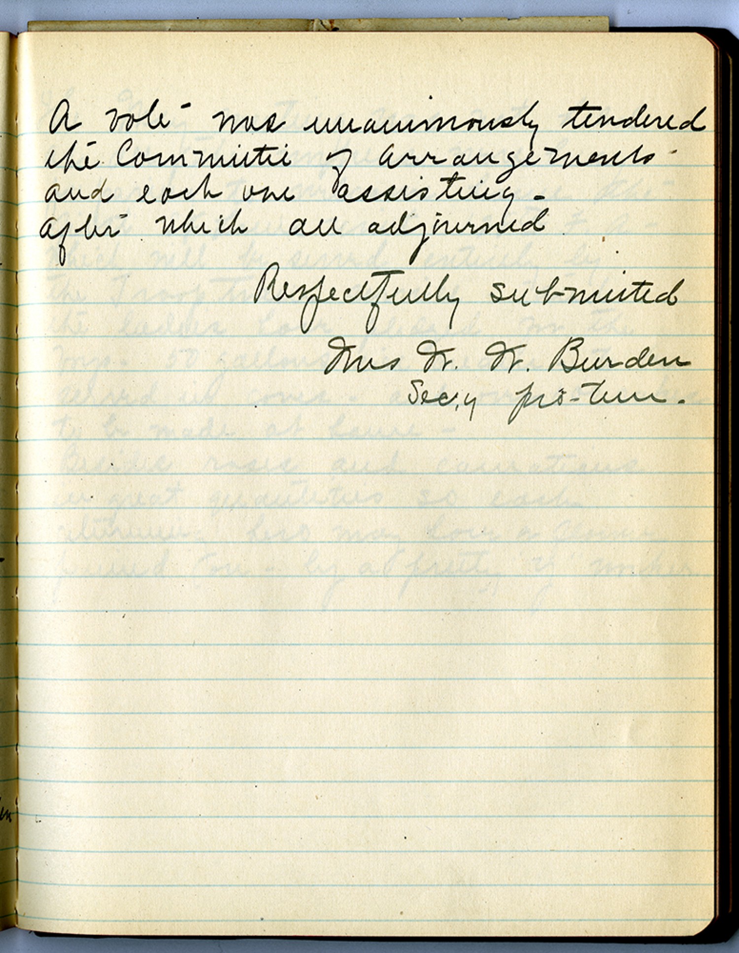 A vote was unanimously tendered the commitee of arrangements – and each one assisting – after which all adjourned Respectfully Submitted Mrs. W. W. Burden Secy pro-tem.