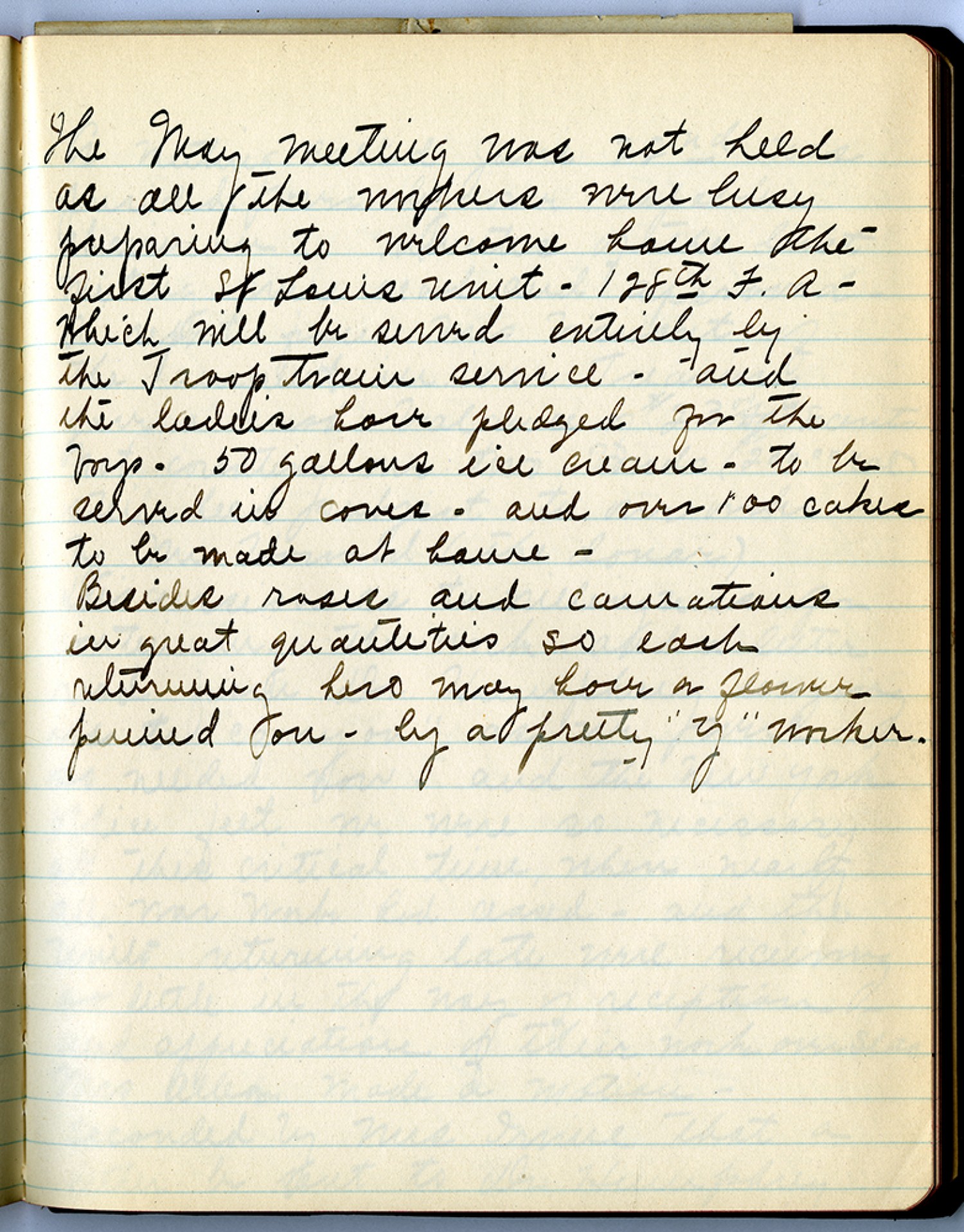 The May meeting was not held as all the makers were busy preparing to welcome home the first St Louis unit – 128th F.A. – which will be served entirely by The Troop Train Service and the ladies have pledged for the boys – 50 gallons ice cream – to be served in cones – and over 100 cakes to be made at home - Besides roses and carnations in great quantities so each returning hero may have a flower pinned on – by a pretty “Y” worker.