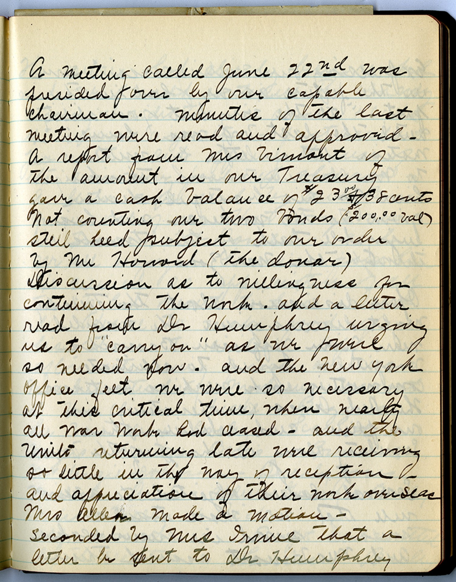 A meeting called June 22nd [1919] was presided over by our capable chairman – minutes of the last meeting were read and approved – a report from Mrs Vimont of the amount in our Treasury gave a cash balance of $23.00 & 38 cents Not counting our two bonds ($200.00 val) still heed subject to our order by Mr Howard (the donor) Discussion as to Willing use for continuing the work. and a letter read from Dr Humphrey urging us to “carry on” as we were so needed now- and the New York office felt we were so necessary at this critical time, when nearly all war work had ceased – and the Units returning late were receiving so little in the way of reception – and appreciation of their work overseas Mrs Allen made a motion – Seconded by Mrs Irvine that a letter be sent to Dr Humphrey