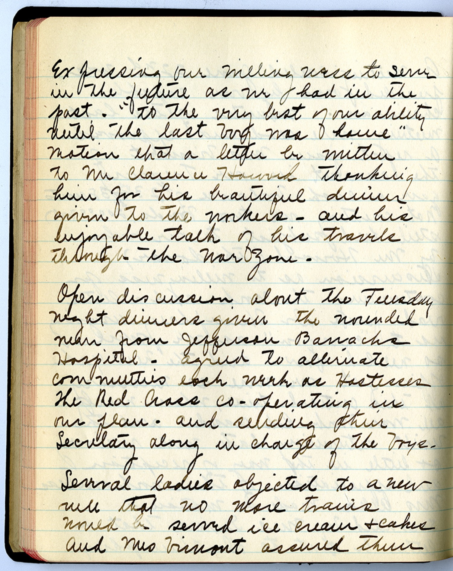 Expressing our willing ness to serve in the future as we had in the past. “to the very best of our ability until the last boy was home” Motion that a letter be written to Mr. Clarence Howard Thanking him for his beautiful dinner given to the workers – and his enjoyable talk of his travels through the War zone. Open discussion about the Tuesday night drive given the wounded men from Jefferson Barracks Hospital – agreed to alternate committees each week as Hostesses The Red Cross co-operating in our plan – and sending their Secretary along in charge of the boys. Several ladies objected to a new rule that no more trains would be served ice cream & cakes and Mrs Vimont assured them