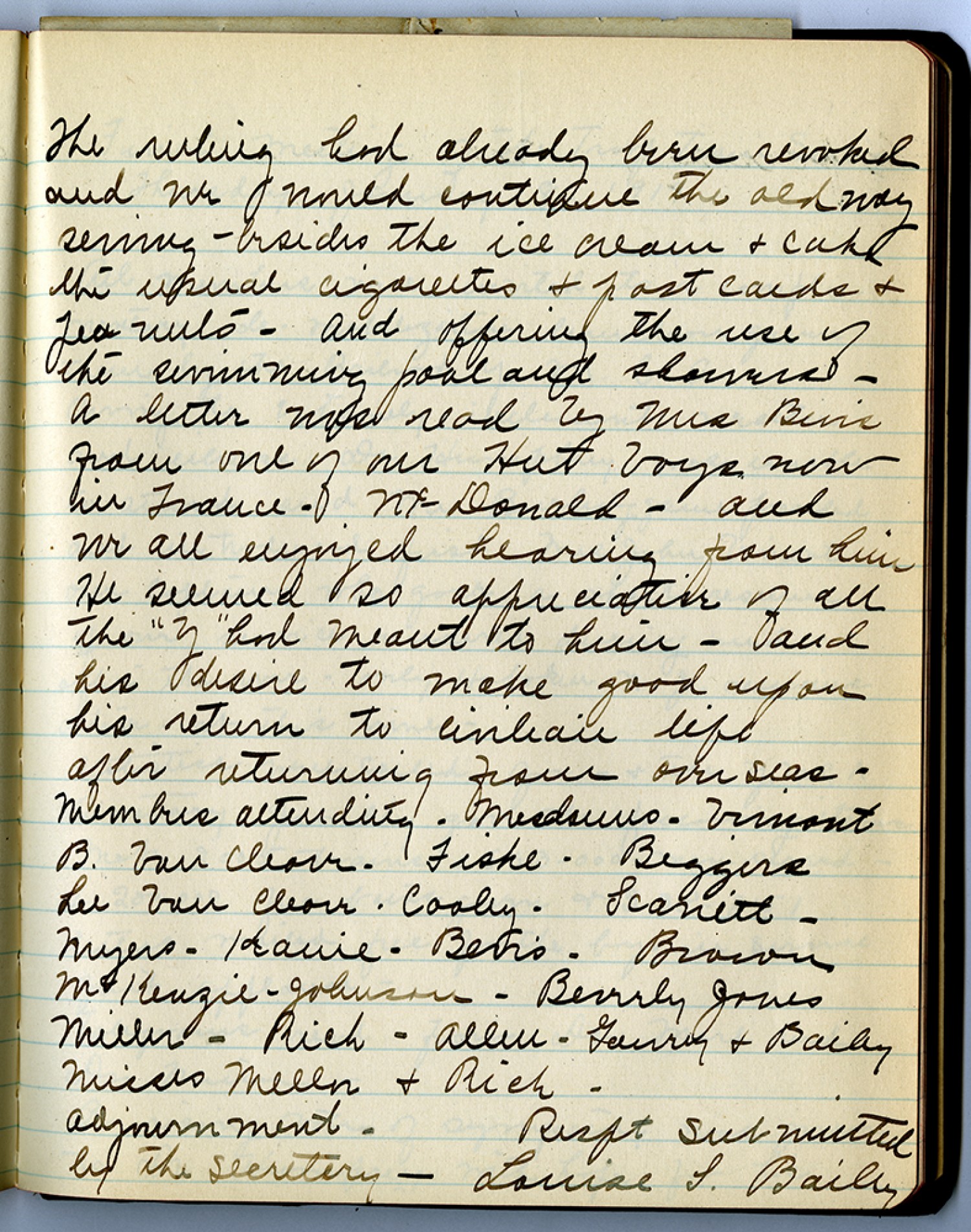 The ruling had already been revoked and we would continue the old way serving – besides the ice cream & cake the usual cigarettes & post cards & tea nuts – and offering the use of the swimming pool and showers - a letter was read by Mrs. Buris from one of our Hut boys now in France – McDonald – and we all enjoyed hearing from him He seemed so appreciative of all the “Y” had meant to him – and his desire to make good upon his return to civilian life after returning from overseas – Members attending Mesdames – Vimont B Von Cleave – Fishe – Biggers Lee Von Cleave – Cooley – Scarrett – myers – Kauie – Berr’s – Brown McKenzie – Johnson – Bevrly Jones Miller – Rich – Allen – Gaurey and Bailey Misses Miller and Rich – Adjournment Respt submitted by the secretary – Louise S. Bailey