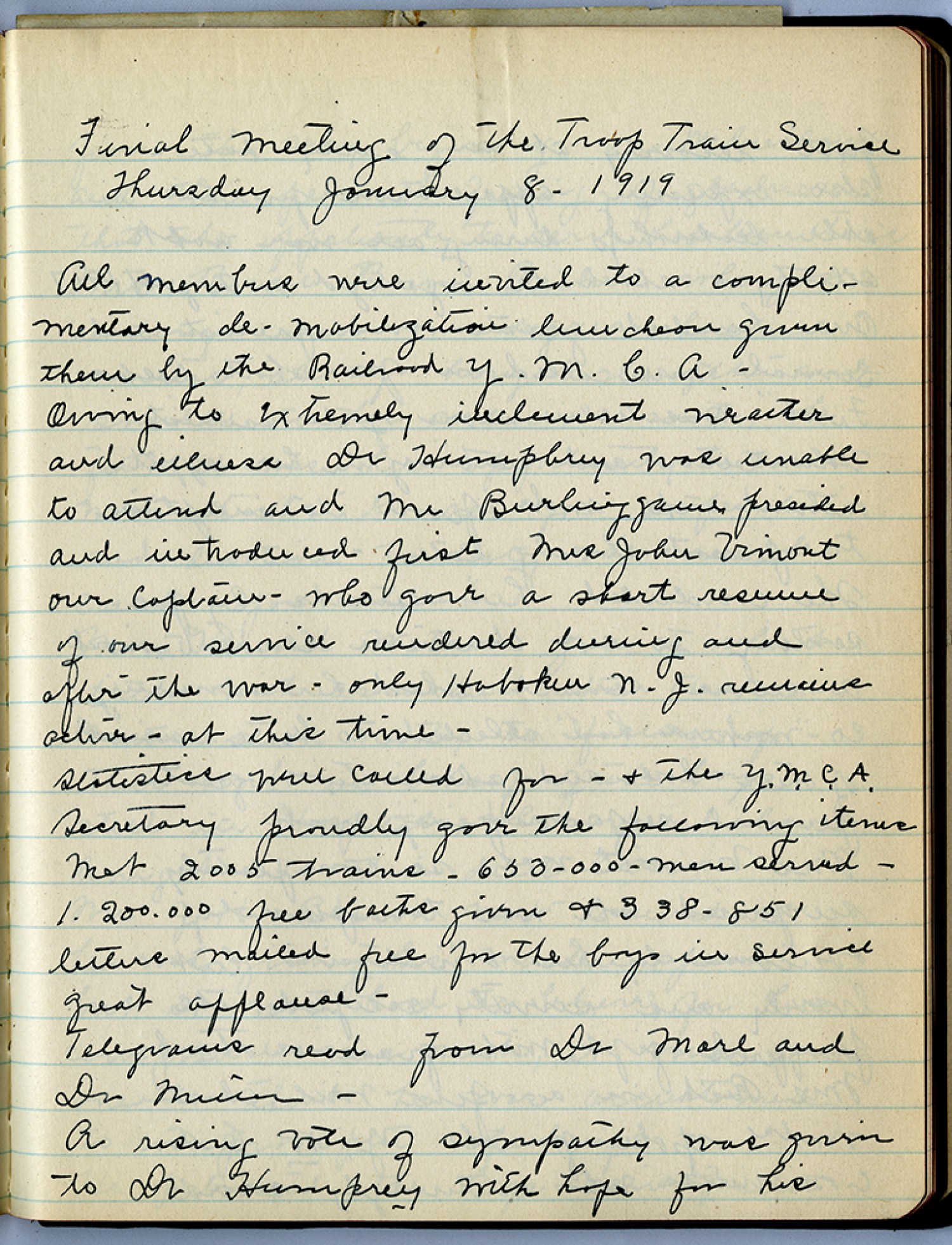 Final Meeting of the Troop Train Service Thursday January 8 – [1920] All members were invited to a complimentary de-mobilization luncheon given them by the Railroad Y.M.C.A – Owing to extremely inclement weather and illness Dr Humphrey was unable to attend and Mr Burlinggame presided and introduced first Mrs John Vimont our Captain – who gave a short resume of our service rendered during and after the war – only Hoboken N.J. remains active – at this time- statistics were called for – and the Y.M.C.A. Secretary proudly gave the following items Met 2005 trains – 650, 000 –Men served – 1.200.000 free [ms illegible: 1 wd] given and 338-851 letters mailed free for the boys in service great applause- Telegrams read from Dr Mare and Dr Miller – A rising vote of sympathy was given to Dr. Humphrey with hope for his