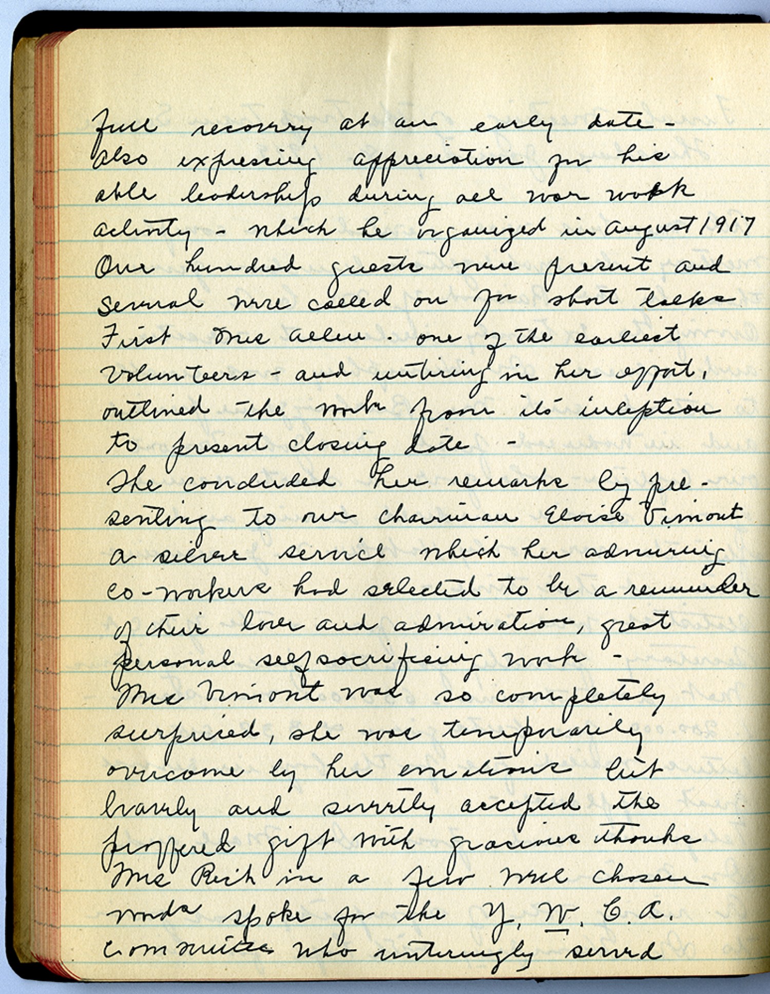full recovery at an early date – Also expressing appreciation for his able leadership during all war work activity – which he organized in August 1917 Over hundred quests were present and several were called on for short talks First Mrs Allen – one of the earliest volunteers – and untiring in her effort, outlined the work from its inception to present closing date - She concluded her remarks by presenting to our chairman Eloise Vimont a silver service which her admiring co-workers had selected to be a reminder of their love and admiration, great personal self sacrificing work – Mrs. Vimont was so completely surprised, she was temporarily overcome by her emotions but bravely and [ms illegible: 1 wd] accepted the proffered gift with gracious thanks Mrs. Rich in a few were chosen words spoke for the Y.W.C.A. communities who untiringly served