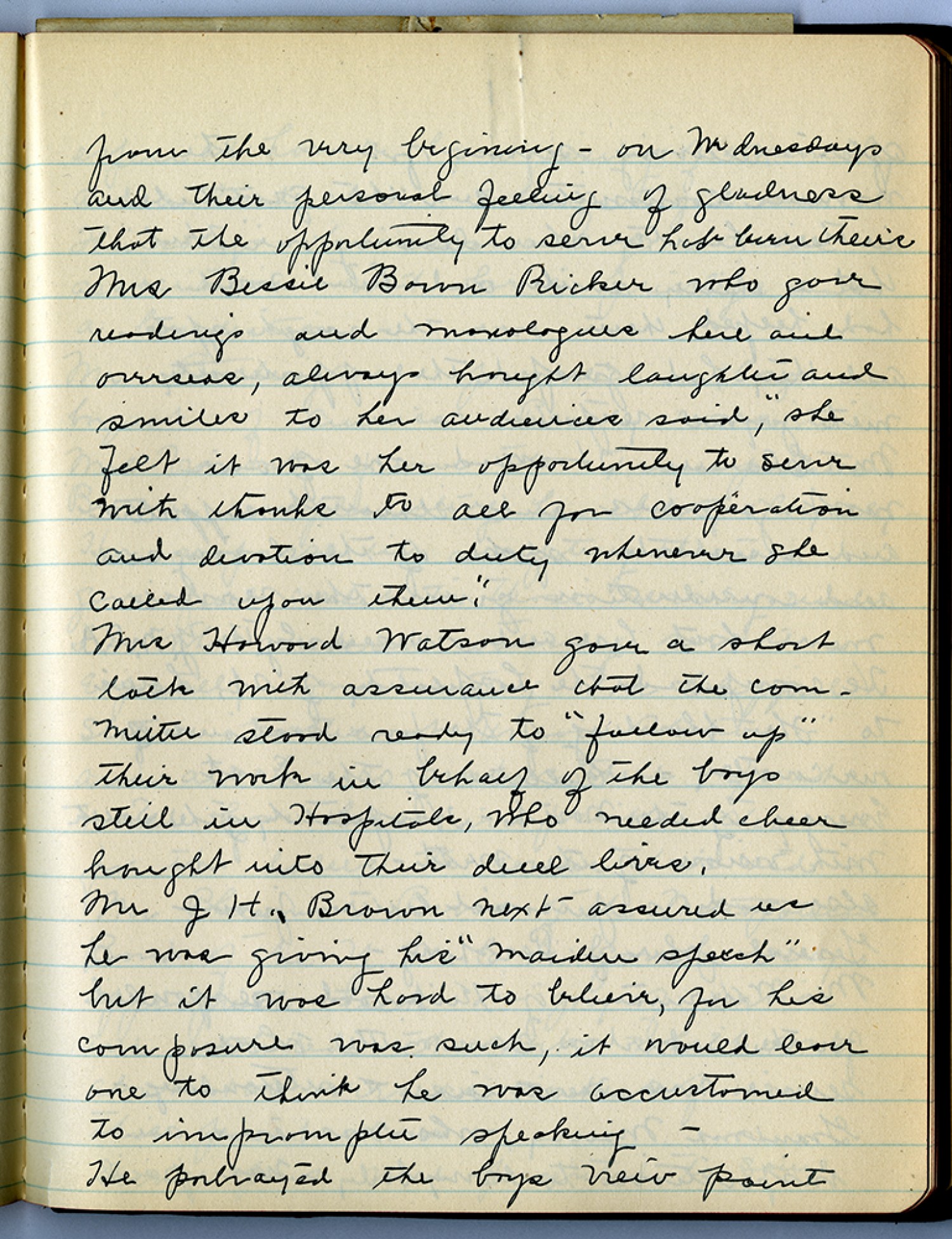 from the very begining – our Wednesdays and their personal feeling of gladness that the opportunity to serve had been theirs Mrs. Bessie Bown Ricker who gave readings and monologues here and overseas, always bought laughter and smiles to her audiences said, “she felt it was her opportunity to serve with thanks to all for cooperation and devotion to duty whenever she called upon them.“ Mrs Howard Watson gave a short talk with assurance that the committee stood ready to “follow up” their work in behalf of the boys still in hospitals, who needed cheer brought into their dull lives, Mr. J H. Brown next – assured us he was giving his “maiden speech” but it was hard to believe, for his composure was such, it would leave one to think he was accustomed to impromptu speaking – He portrayed the boys veiw point