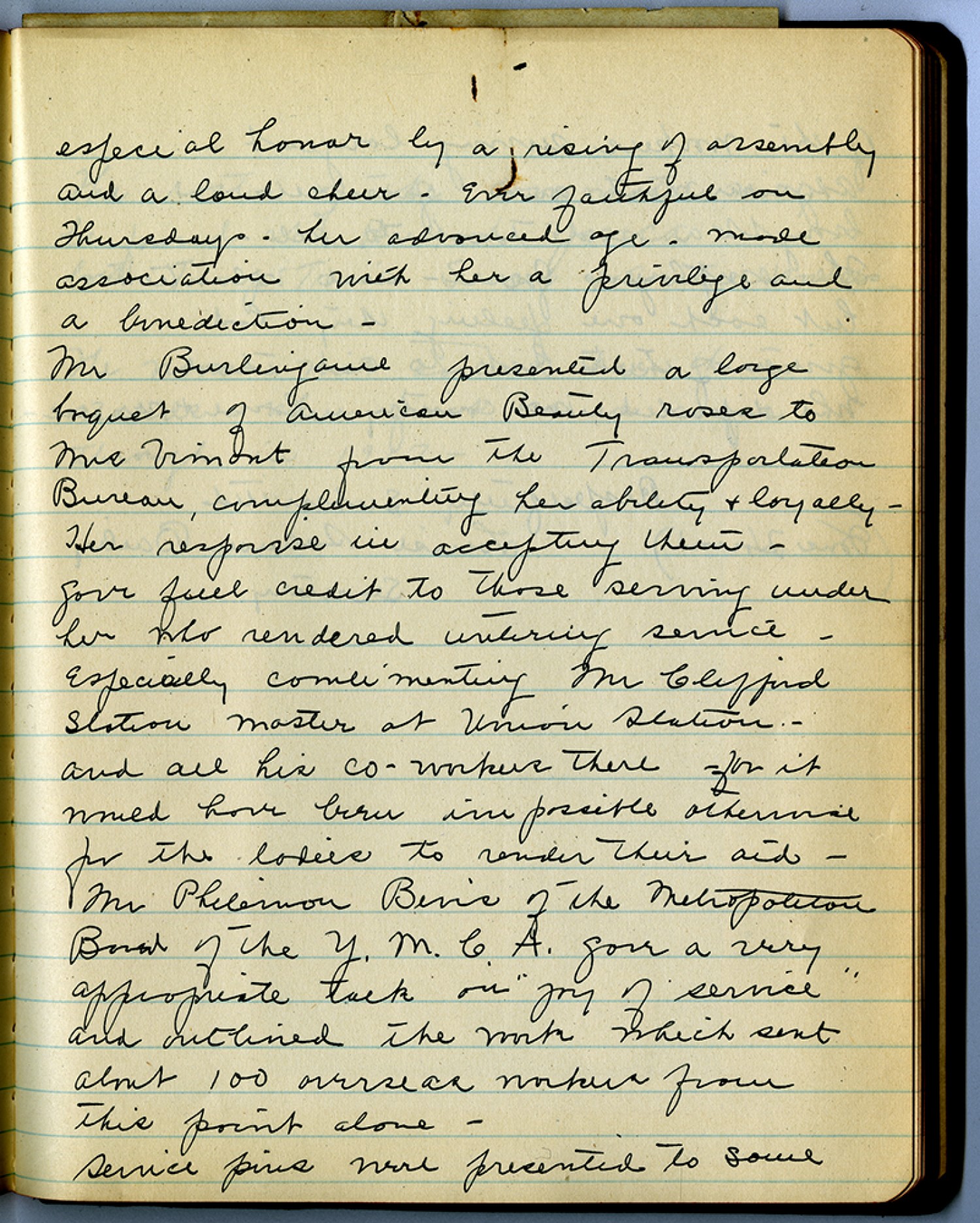 especial honor by a rising of assembly and a loud cheer – Ever faithful on Thursdays – her advanced age – made association with her a privilege and a benediction – Mr Burlingaure presented a large bouquet of American Beauty roses to Mrs Vimont from the Transportation Bureau, complimentary her ability & loyally – Her response in accepting them – gave full credit to those serving under her who rendered untiring service – especially comlimenting Mr. Clifford Station Master of Union Station – and all his co-workers there for it would have been impossible otherwise for the ladies to render their aid – Mr. Philemon Bevis of the Metropolitan Board of the Y.M.C.A. gave a very appropriate talk on “joy of service” and outlined the work which sent about 100 overseas workers from this point alone – service pins were presented to some