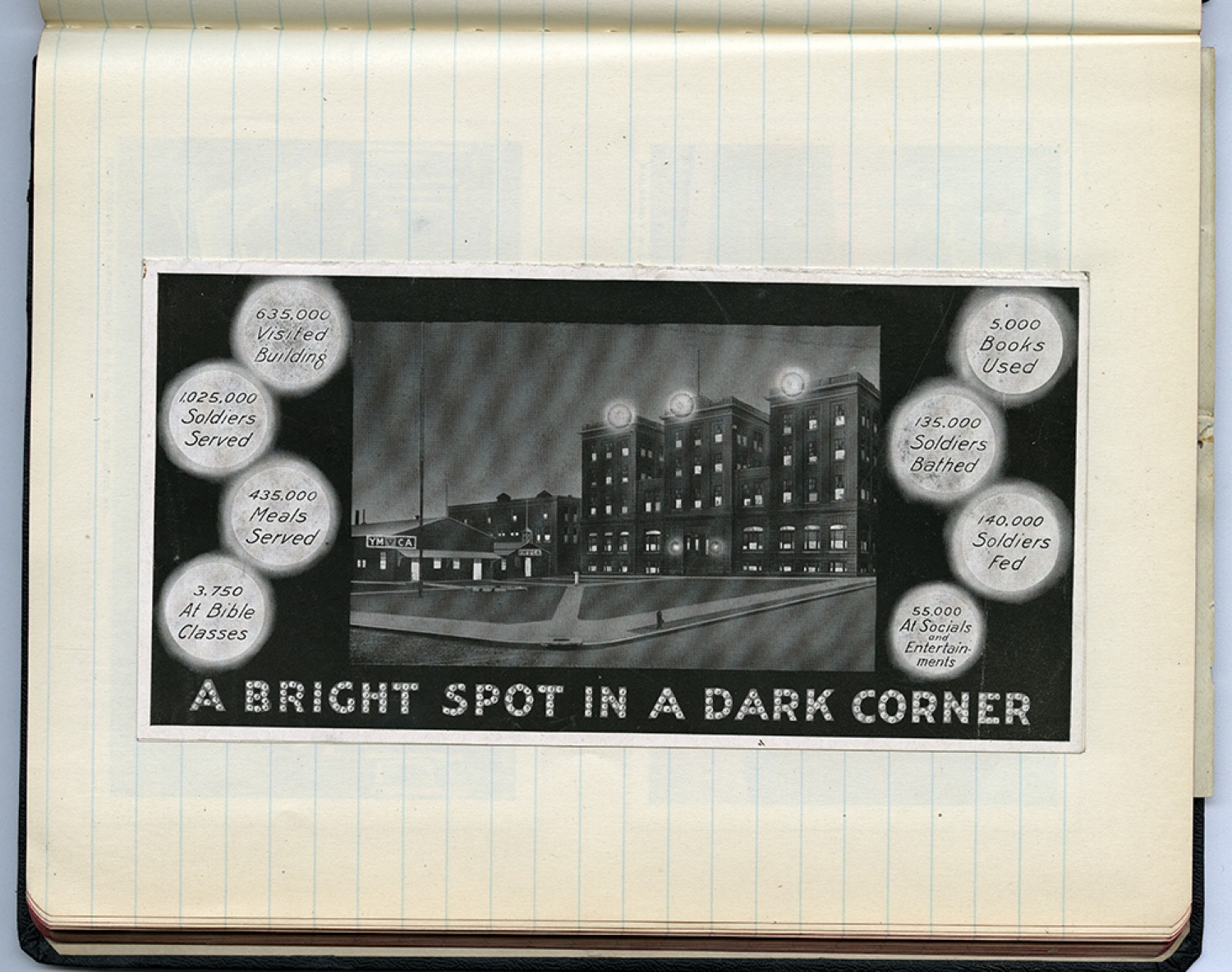 [pamphlet] 635,000 Visited Building 1,025,000 Soldiers Served 435,000 Meals Served 3,750 At Bible Classes 5,000 Books Used 135,000 Soldiers Bathed 140,000 Soldiers Fed 55,000 At Socials and Entertainments A BRIGHT SPOT IN A DARK CORNER