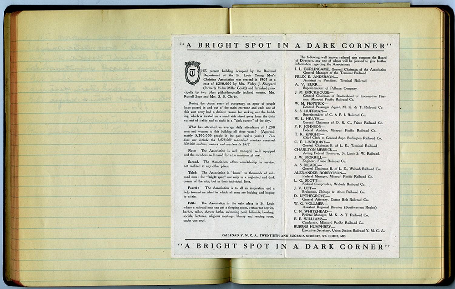 [pamphlet] “A BRIGHT SPOT IN A DARK CORNER” THE present building occupied by the Railroad Department of the St. Louis Young Men’s Christian Association was erected in 1907 at a cost of $250,000 by Mrs. Finley J. Sheppard (formerly Helen Miller Gould) and furnished principally by two other philanthropically inclined women, Mrs. Russel Sage and Mrs. S. S. Clarke. During the dozen years of occupancy an army of people have passed in and out of the main entrance and each one of this vast army had a definite reason for seeking out the building, which is located on a small side street away from the daily current of traffic and at night in a “dark corner” of the city. What has attracted an average daily attendance of 1,200 men and women to this building all these years? (Approximately 5,200,000 people in the past twelve years.) This does not include the 1,026,000 individual services rendered 750,000 soldiers, sailors and marines in 1918. First: The Association is well managed, well equipped and the members well cared for at a minimum cost. Second. The Association offers comradeship in service, not realized at any other place. Third: The Association is “home” to thousands of railroad men; the “bright spot” not only in a neglected and dark corner of the city, but in their individual lives. Fourth: The Association is to all an inspiration and a help toward an ideal to which all men are looking and hoping to attain. Fifth: The Association is the only place in St. Louis where a railroad man can get a sleeping room, restaurant service, barber, tailor, shower baths, swimming pool, billiards, bowling, socials, lectures, religious meetings, library and reading room, under one roof. The following well known railroad men compose the Board of Directors, any one of whom will be pleased to give further information regarding the Association: . L. BURLINGAME, General Chairman of the Association General Manager of the Terminal Railroad FELIX E. ANDERSON – Assistant to President, Terminal Railroad A. V. BURR –Superintendent of Pullman Company J. M. BRICKHOUSE – General Chairman of Brotherhood of Locomotive Firemen, Missouri Pacific Railroad Co. W. M. FENWICK – General Passenger Agent, M.K. and T. Railroad Co. S.S. HUFFMAN – Superintendent of C. and E. I. Railroad Co. W.L. HEATH – General Chairman of O.R.C., Frisco Railroad Co. F.P. JOHNSON – Federal Auditor, Missouri Pacific Railroad Co. T.K. KNIGHT – Chief Clerk to General Supt. Burlington Railroad Co. C.E. LINDQUIST General Chairman B. of L.E., Terminal Railroad CHARLTON MESSICK Acting Federal Treasurer, St. Louis S.W. Railroad. J.W. MORRILL – Engineer, Frisco Railroad Co. A.S. MEADE – General Chairman B. of L. E., Wabash Railroad Co. Alexander Robertson – Federal Manager, Missouri Pacific Railroad Co. L.G. Scott – Federal Comptroller, Wabash Railroad Co. J.V. Utt – Brakeman, Chicago and Alton Railroad Co. D. UPTHEGROVE – General Attorney, Cotton Belt Railroad Co. W.G. VOLLMER – Assistant Regional Director (Southwestern Region) C.N. WHITEHEAD – Federal Manager, M. K. and T. Railroad Co. E.E. WILLIAMS – Conductor, Missouri Pacific Railroad Co. RUBENS HUMPHREY – Executive Secretary, Union Station Railroad Y.M.C.A. RAILROAD Y.M.C.A., TWENTIETH AND EUGENIA STREETS, ST. LOUIS, MO. “A BRIGHT SPOT IN A DARK CORNER”