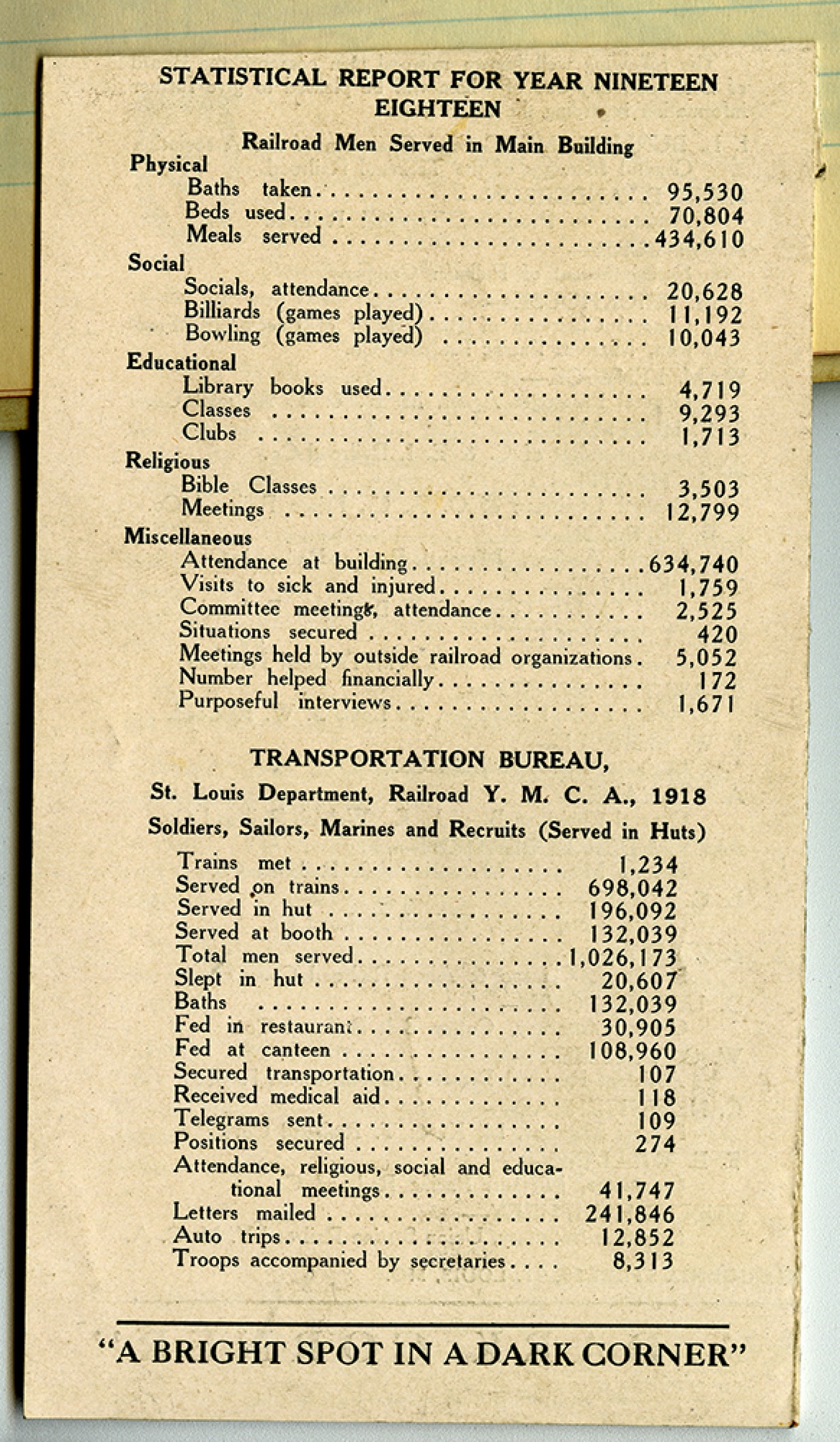 [pamphlet] STATISTISTICAL REPORT FOR THE YEAR NINETEEN EIGHTEEN Railroad Men Served in Main Building Physical Baths Taken.....95,530 Beds used.....70,804 Meals served .....434,610 Socials, attendance 20, 628 Billiards (games played).....11,192 Bowling (games played).....10,043 Educational Library books used.....4.719 Classes.....9,293 Clubs.....1,713 Religious Bible Classes.....3,503 Meetings.....12,799 Miscellaneous Attendance at building.....634, 740 Visits to sick and injured.....1,759 Committee meetings, attendance 2,525 Situations secured 420 Meetings held by outside railroad organizations. 5, 052 Number helped financially 172 Purposeful interviews....1,671 TRANSPORTATION BUREAU, St. Louis Department, Railroad Y.M.C.A. , 1918 Soldiers, Sailors, Marines and Recruits (served in Huts) Trains met .....1,234 Served on trains.....698,042 Served in hut.....196,092 Served at booth .....132,039 Total men served..... 1,026,173 Slept in hut.....20, 607 Baths.....132,039 Fed in restaurant..... 30,905 Fed at canteen..... 108,960 Secured transportation.....107 Received medical aid.....118 Telegrams sent.....109 Positions secured.....274 Attendances, religious, social and educational meetings..... 41, 747 Letters mailed .....241,846 Auto trips .....12,852 Troops accompanied by secretaries..... 8,313 “A BRIGHT SPOT IN A DARK CORNER”