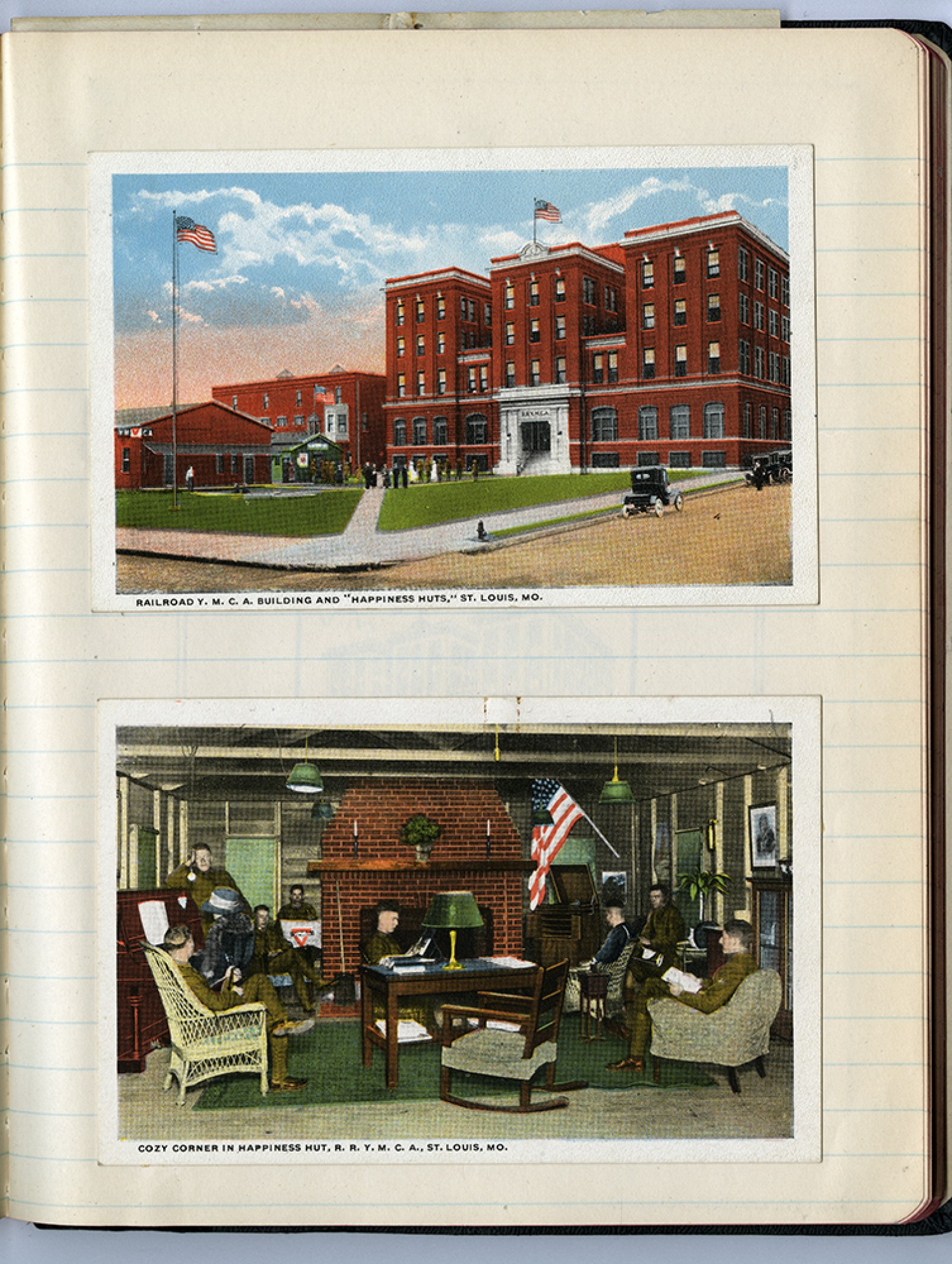 [postcard] RAILROAD Y.M.C.A. BUILDING AND “HAPPINESS HUTS,” ST. LOUIS,[MISSOURI] [postcard] COZY CORNER IN HAPPINESS HUT, R.R.Y.M.C.A., ST. LOUIS, [MISSOURI]