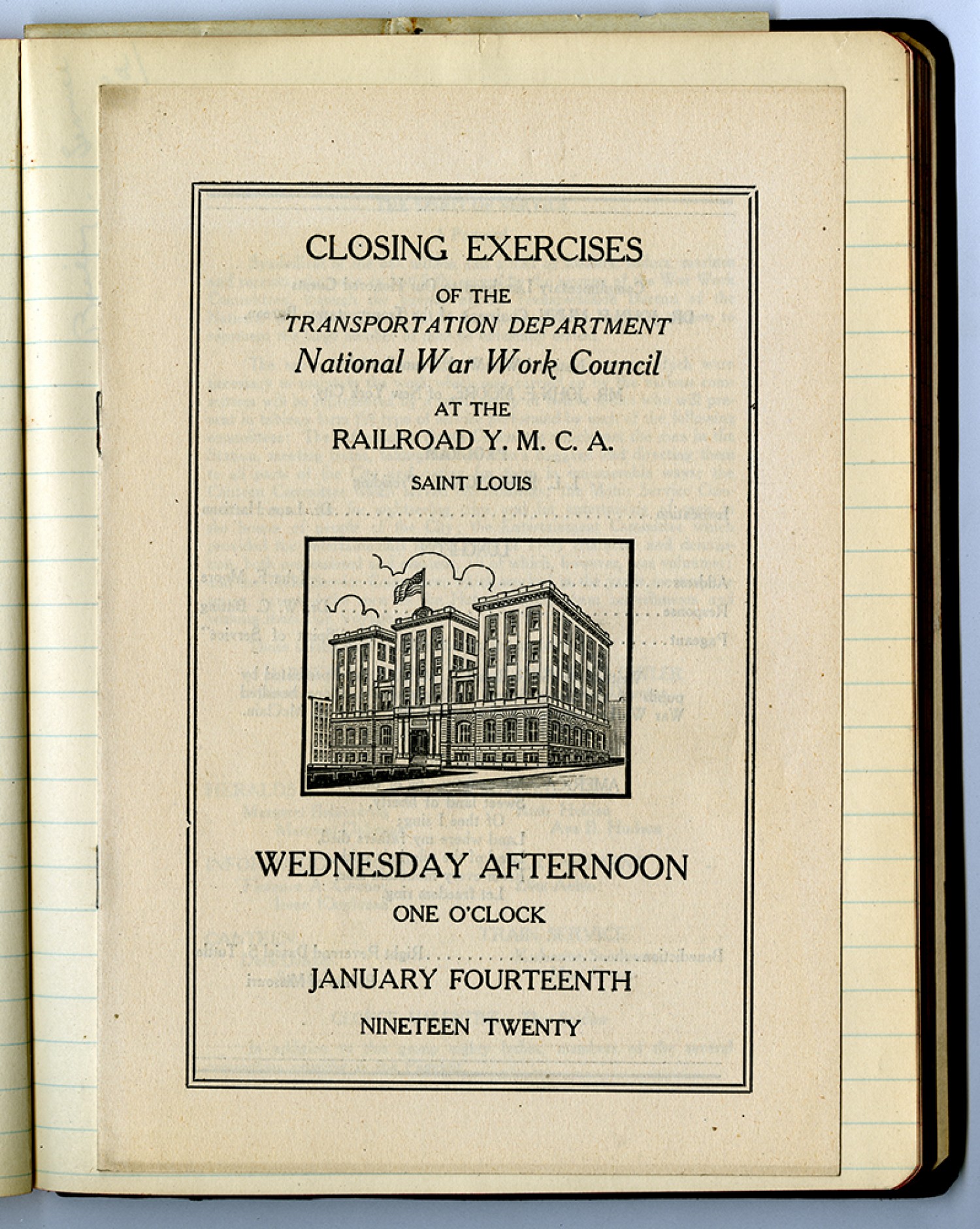 [program] CLOSING EXERCISES OF THE TRANSPORTATION DEPATMENT National War Work Council AT THE RAILROAD Y.M.C.A. SAINT LOUIS WEDNESDAY AFTERNOON ONE O’CLOCK JANUARY FOURTEENTH NINETEEN TWENTY